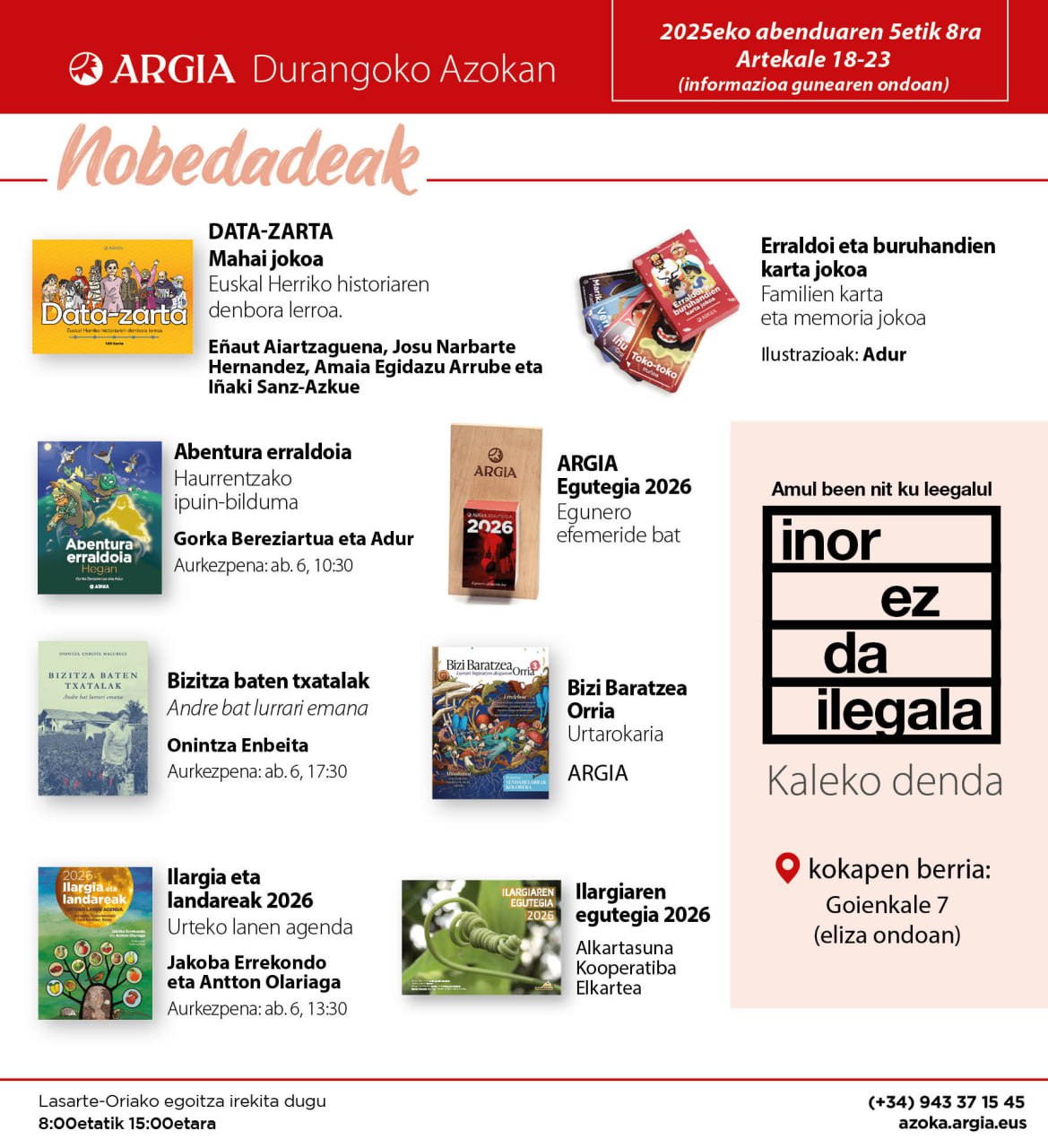 Aurtengo Durangoko Azokan, hiru liburu edo proiektu aurkezpen egingo dituzte ARGIAk eta Bizi Baratzeak. Egileak standean egongo dira, eta beste urte batez, Durangoko Santa Ana elizaren aldamenean, denda ipiniko du ARGIAk, Inor Ez Da Ilegala proiektua hauspotzeko.