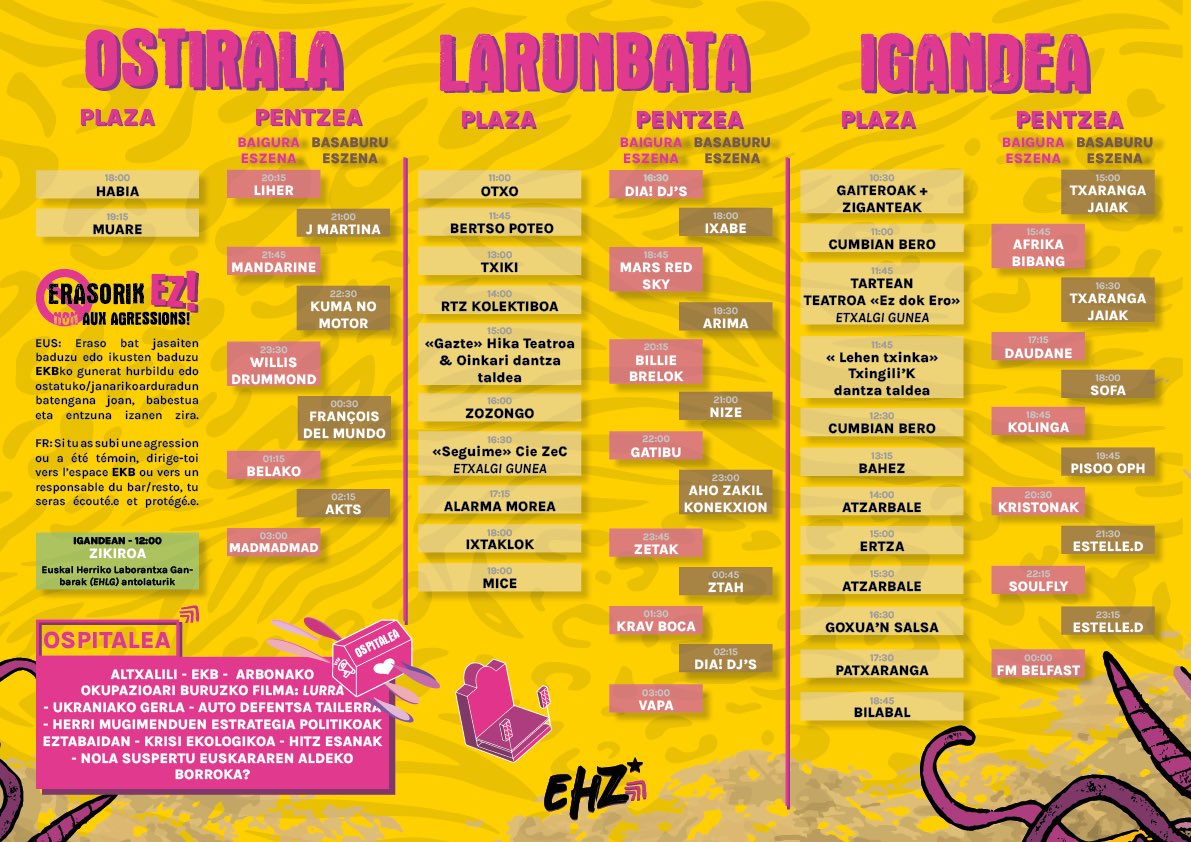 Urtetik urtera hazten ari da EHZ festibala. Aurtengoa 27. edizioa izango du, eta jada ondo baino hobeto egonkorturik dago Irisarriko herrian. Plaza eta Pentzeako zonaldea, aurten azken hau bi eszenetan bereizia, dagoeneko oso leku ohikoa eta erosoa bilakatu dira bisitarientzat. Datak ere ohikoak izanagatik, urteroko ezinbesteko zita bilakatu da askorentzat. Iñigo Satrustegik zioen iazko kronikan, EHZ oasi bat izan zela pandemiaren erdian, 2021ean, eta hain oroitzapen onak geratu zitzaizkiola, hamabi hilabete pasatu zituela zain berriz EHZ iristeko –aurten handik ikusten baduzue, galde iezaiozue ea in crescendo joan den bere motibazioa–.
