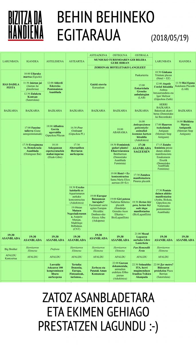 Sare sozialen bidez aste osorako egitarau bat publikatu dute. Adierazi dutenez, hori jada lotuta dagoena da. Hortik aurrera, asanbladetan ekimen gehiago prestatzeko aukera izango da.