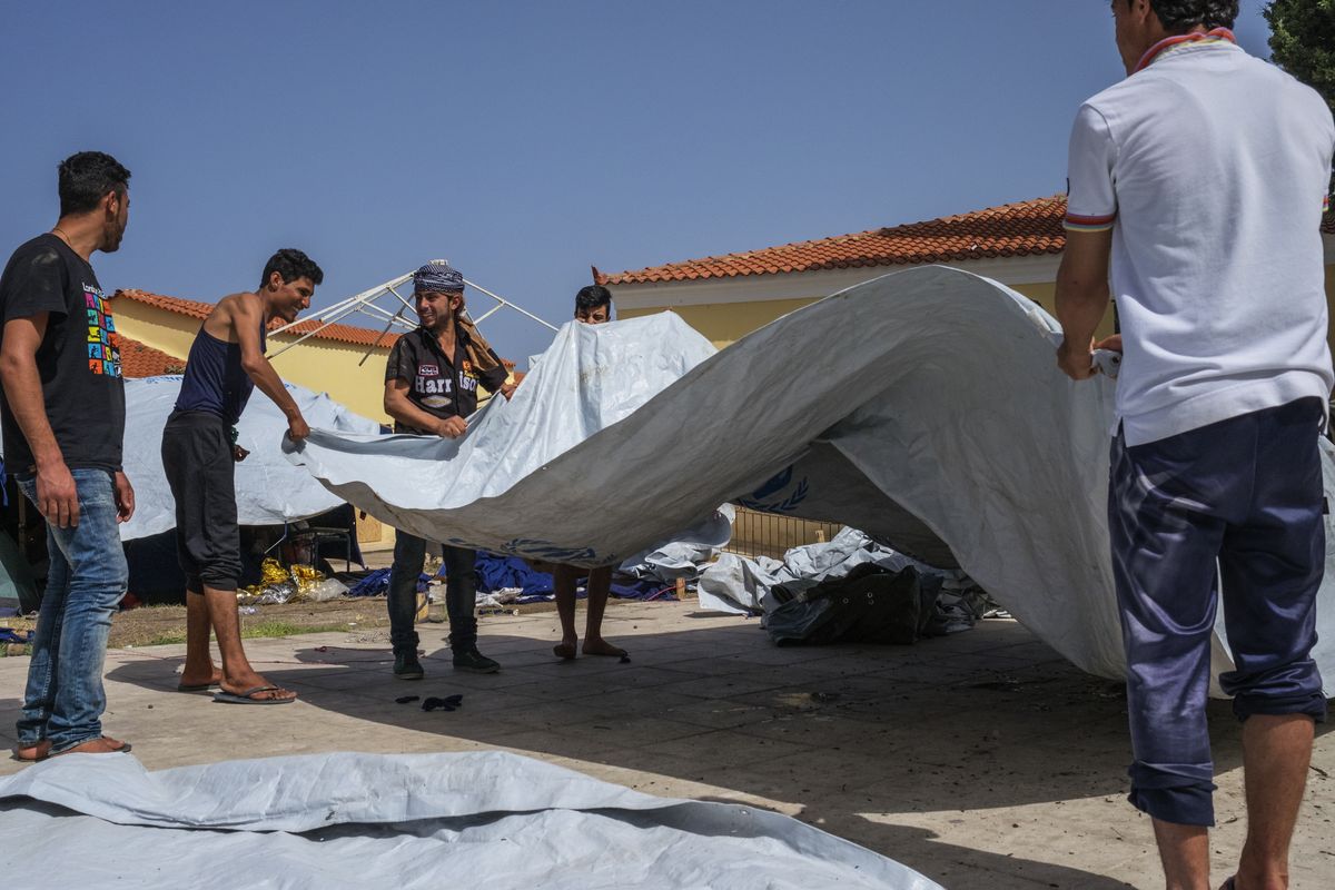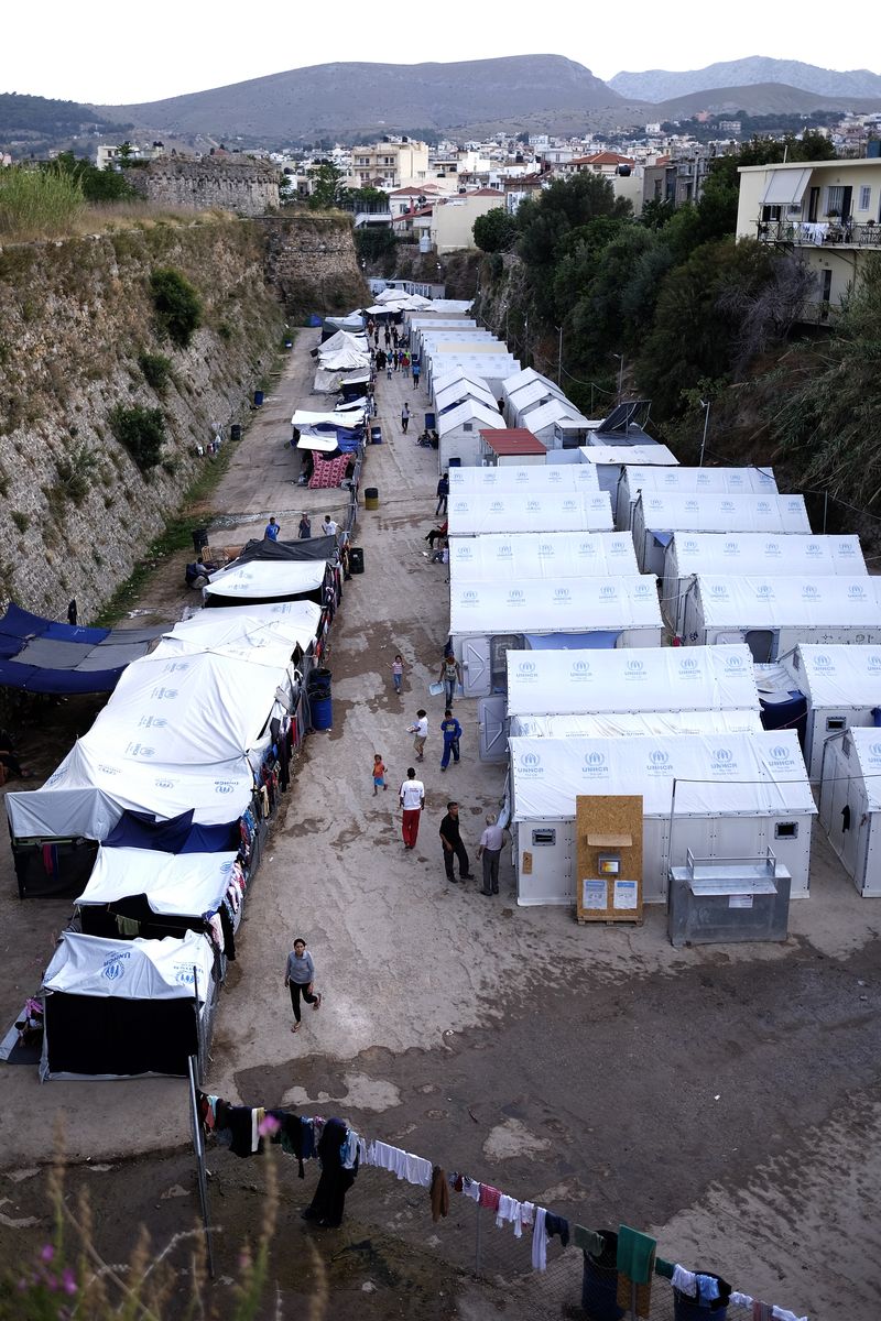 Hiru kanpamentu nagusi daude. Bi kanpamentu irekiek Souda eta Dipethe, Chios hiriaren zentroan daude eta 1.100 eta 500 errefuxiatu inguru dituzte. GKEek eta UNHCR erakundeak kudeatzen dute eta errefuxiatuak antolatuta daude kanpamentuaren mantenurako.