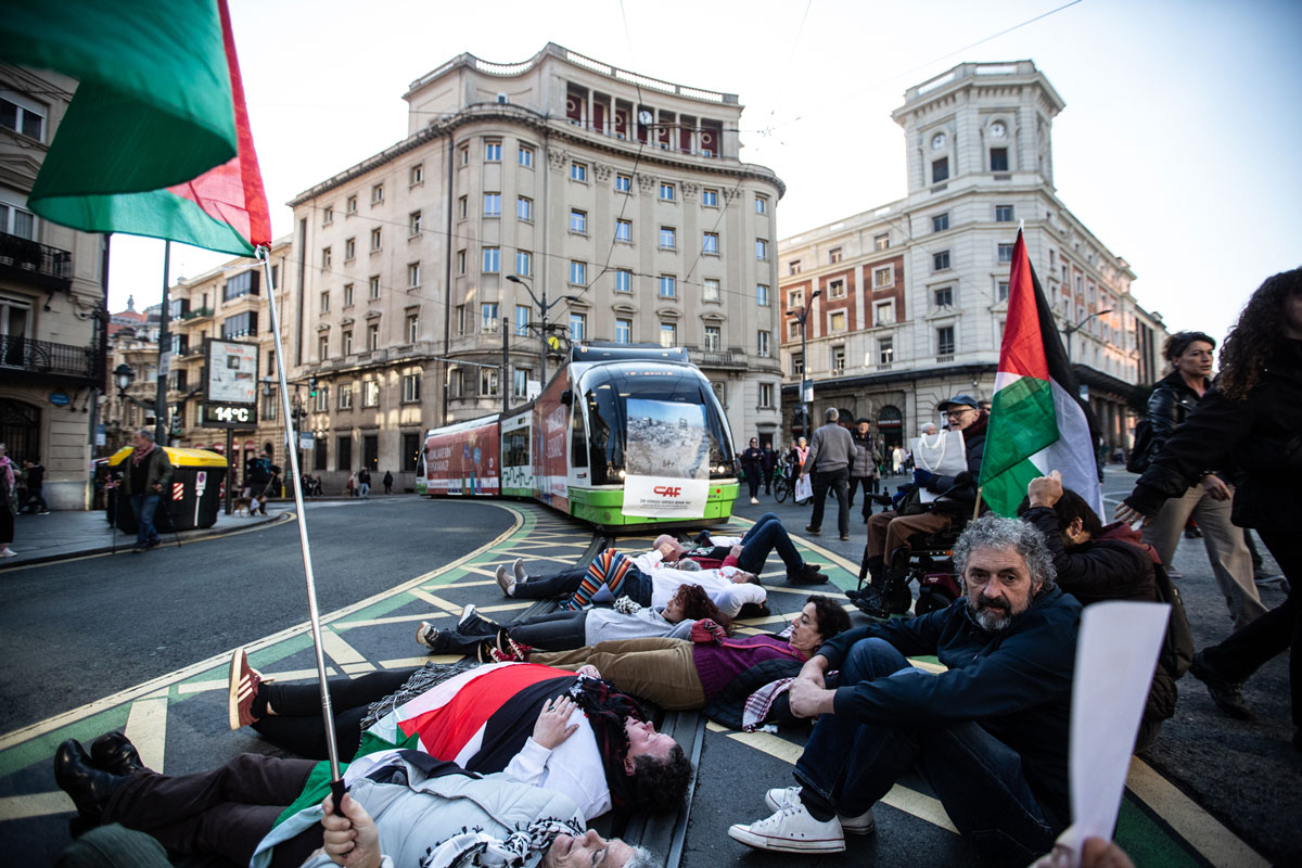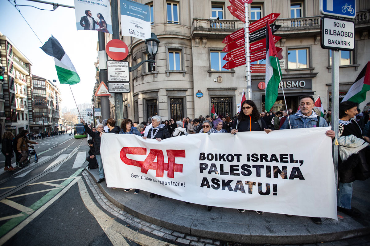 CAFek Israelgo genozidioan eta apartheidean duen papera salatzeko kanpainak ez du etenik: aste honetako bigarren ekintza egin dute larunbat goizean, Bilbon. Euskal Herriko Global Movement to Gaza plataformak deituta, Plaza Biribilean batu dira eta protesta egin dute, berriro ere, salatzeko azpiegituren enpresa sionisten konplize zuzena dela. Bilboko tranbiaren aurkako ekintza egin dute, enpresa Jerusalemen egiten ari den tranbia ilegalari keinu eginez. Eta bertara agertu da Polizia: zenbait ekintzaile identifikatu, euren aurka kargatu eta ekintzaile bat atxilotu du. Atxilotuaren kideekin hitz egin du ARGIAk, eta bera “lehenbailehen” askatzeko aldarria egiteaz gain, salatu dute elkartasuna kriminalizatzen ari direla, eta alderantziz beharko lukeela, CAF eta bere laguntzaileak kriminalizatu beharko lituzketela: “Beraiek gabe ez litzateke posible genozidioa aurrera eramatea”.