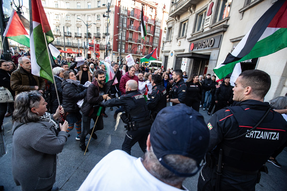 Jada ohiko bihurtu den Boikot Israel, Palestina askatu! lelodun pankartarekin batu dira Bilboko Plaza Biribilean larunbat eguerdian. Hamarnaka ekintzailek egin dute bat plataformaren deialdiarekin, eta, ekintza baketsu batean, bidea itxi diote Bilboko tranbiari, errailen gainean etzanda. Ertzaintza bertaratu eta bertaratutakoak identifikatzeari ekin dio. Mugimenduko kideek, identifikazioa eskatzerakoan, “Palestina askatu” erantzun dute, eta orduan hasi dira liskarrak: aldarri hori plazaratu duen kideetako bat izan da atxilotua.