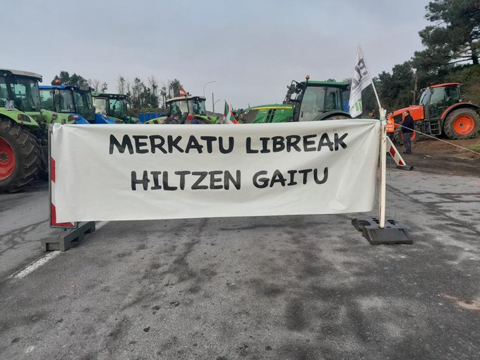 “Laborariak Baionako portua blokatzen ari dira, merkatu libreak eragiten duen lehia desleialaren salatzeko! Nazioarteko akordioek laborariak prekarizatzen dituzte!”. Hori da Baionako portuaren blokeoa aurrera daramaten ELBko nekazariek sare sozialetan zabaldu duten mezua. Baionako beste hiru industriagunetan ere mobilizazioak bideratzen ari dira sindikatuko hainbat talde.