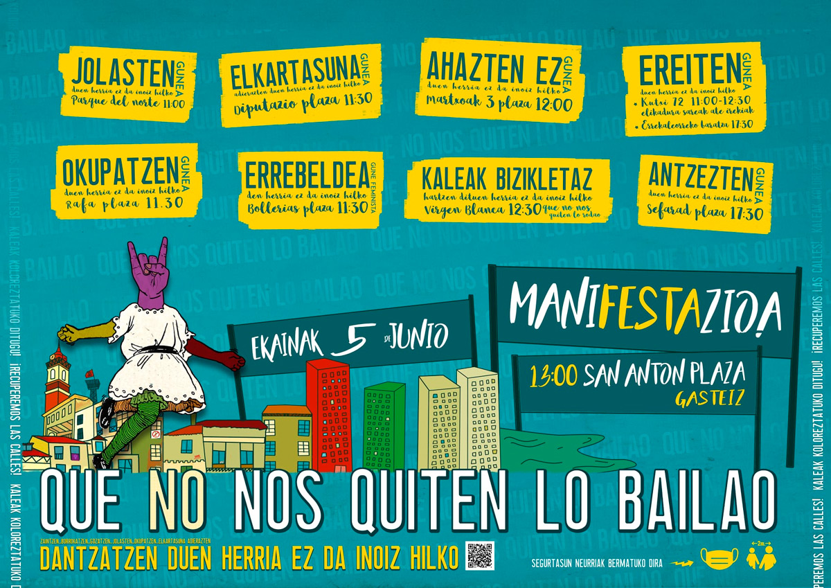 Martxoaren amaieran aurkeztu zen ¡Que no nos quiten lo bailao! Dantzatzen duen herria ez da inoiz hilko ekimena, sareetan zabaldutako bideo baten bitartez. Bizi dugun krisiari gobernuek eta administrazioek emaniko erantzuna kritikatu zuten, eta mugimendu herritarrena goraipatu. Ordutik hona lanean aritu dira ekimeneko kideak, ekainaren 5eko zita prestatzen. Larunbatekoa mobilizazio, aldarrikapen eta gozamen eguna izatea nahi dute. Ekimeneko kide Miren Lapitz eta Eneko Bermejok idatziz erantzun dituzte ARGIAren galderak.