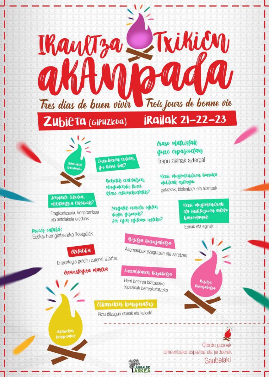 Lurralde Askea kolektiboak bestalde, Iraultza Txikien Kanpaldia deitu du Zubietan, irailaren 21etik 23ra. Egitarau zehatza iraila hasieran plazaratuko duten arren, dagoeneko zenbait xehetasun aurreratu dituzte. “Bestelako Euskal Herria amesten dugun herritar eta herri mugimenduen topalekua izango da”, iragarri dute. Bizipoza nagusi izango duena, ongi bizitzeko errepublikarantz pausoa emateko espazioa. “Bizitza erdigunean jarriko dugu: eremu antipatriarkala izango da, antikapitalista, komunitarioa, autoeratua eta autokritikoa, borrokalaria eta alaia”, iragarri dute antolatzaileek.