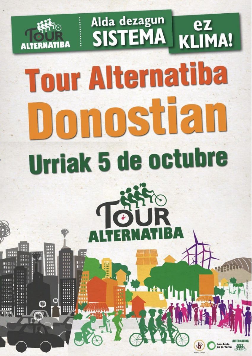 Azkenik, “Alda dezagun sistema, ez klima!” aldarripean ekainaren 9an Parisen abiatu eta urriaren 6tan Baionan amaituko den “Tour Alternatiba” bizikleta martxa Donostiara helduko da urriaren 5ean. Erraustegia geratzeko hainbat ekimen deitu dira egun horretarako Gipuzkoako hiriburuan.
