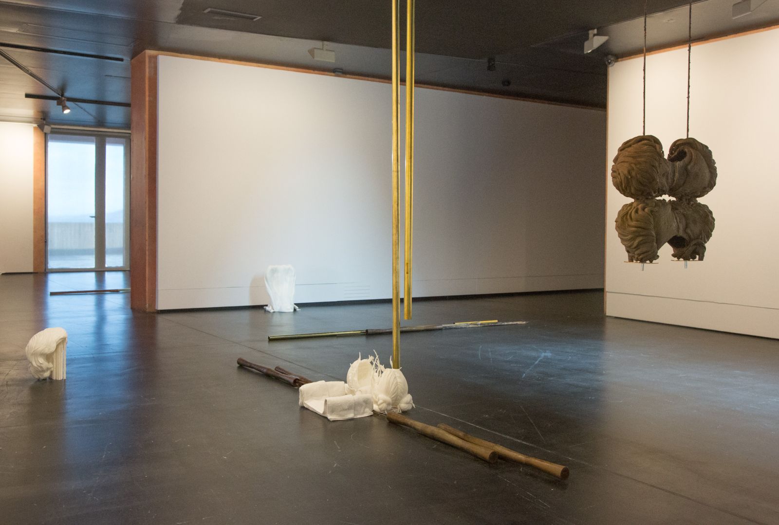 Erakusketaren sarreran artista bakoitzaren obra bana dago, eta hasierako momentu horretatik identifika daitezke hiru artisten joerak eta ondoren espazioan barrera errepikatuta ikusiko ditugun keinuak, kolore-gamak eta akaberak. Miren Doizen eta Nora Aurrekoetxearen obrak segituan identifikatu ditut: lehena, lurrean testura leun eta azalera distiratsua duen mihiztadura eskultorikoa; bigarrena, hormatik eskegita dauden bi buru, non mediak erabili dituen zatar-paperezko bolumenari forma emateko. Albo batean, keramika zuri distiratsuz egindako lau maskor daude hormari lotuta, goitik behera txikitik handira ordenatuta eta guztietan handienak ur pixka bat dauka, elizetan egoten den ur bedeinkatuaren pilan gisa. Intrigatuta, Marina González Guerreiroren obra lehendabizikoz ikustera pasa naiz.