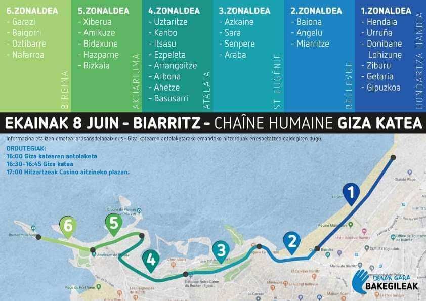 Gizarte zibila deitu nahi izan dute ekainaren 8an Biarritzen 16:00etan egingo den giza-katera. "Bakegileek herritar orori dei egin diote, frantziar Estatuarekin abiatutako prozesua babestu, indartu eta aurrera urratsak emateko inpultsua emateko", gogorarazi dute. Orain Presoak dinamikatik deialdi horrekin bat egin eta Hegoaldeko herritarrak gonbidatu dituzte bertaratzera.
