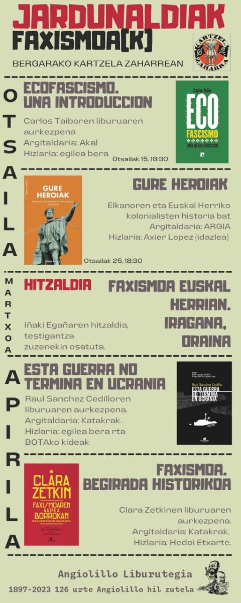 Otsailetik apirilera, Bergarako Kartzela Zaharrak eta Angiolillo liburutegiak faxismoaren nondik norakoak aztertzeko jardunaldia antolatu dute. Ikuspuntu historikotik, faxismoa fenomeno sozial, ideologiko eta politiko bezala jorratu nahi dute.