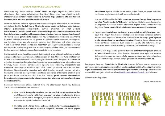 Tokiko plataformak azpimarratu du Aiaraldean gertatzen ari den egoera (energia ekoizpenari lotutako proiektuen gorakada) Euskal Herri osoan jazotzen ari dela eta, horregatik, martxoaren 22an Gasteizen egingo den manifestaziora batuko direla. Konpromiso bera hartzeko eskatu diete herritarrei.