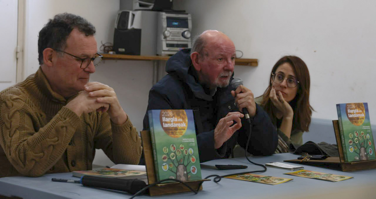 Bertsoak, azalpenak, ilustrazioak eta umorea uztartu zituzten Jakoba Errekondok, Antton Olariaga eta Maddalen Arzallusek Biriatun, III. Arbolaren Bestan, 2026ko Ilargia eta Landareak agenda aurkezteko ekitaldi berezian. Fruta arbolak ditu ardatz ARGIAren Bizi Baratzea ildoak bederatzigarrenez kaleratu duen agendak.