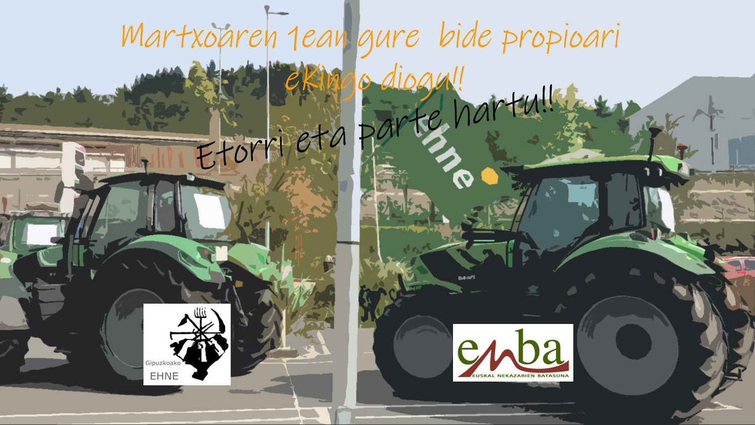 Martxoaren 1eko protestan, sektorearentzat “ezinbestekoak diren neurriak eta politikak” mahai gainean jarriko dituzte. Ez dute egunaren zehaztasun gehiagorik eman hedabideei bidalitako oharrean. Gaineratu dute Euskal Herriko sindikatuekin hitz egingo dutela eta ondorengo egunetarako egutegi bat adosten ahaleginduko direla.