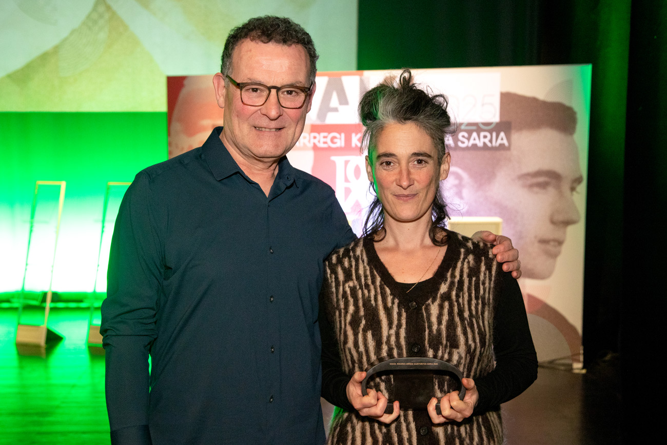 Jakoba Errekondo, Mikel Arregiren eskutik Rikardo Arregi Kazetaritza Sariko Ohorezko Mugarria jaso berri. Dani Blanco / ARGIA CC BY-SA