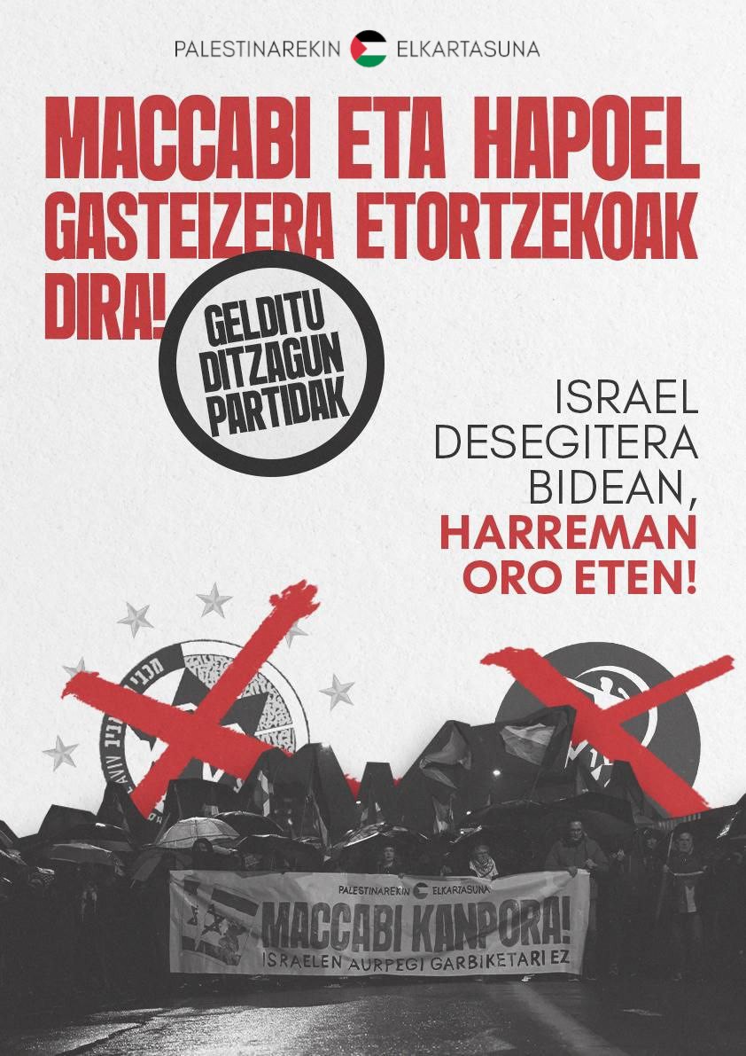 • Datorren urteko martxoaren 27an Hapoel eta apirilaren 7an Maccabi talde sionistak etorriko dira Buesa Arenara Baskoniaren aurkako partidak jokatzera. Bi taldeek lotura zuzena dute Israelgo Estatu eta proiektu sionistarekin. Palestinarekin Elkartasuna plataformatik partida hauen aurkako kanpainak abiatuko dituztela esan dute Suelta la Ollan egindako elkarrizketan.