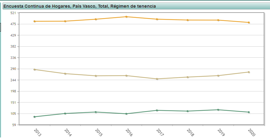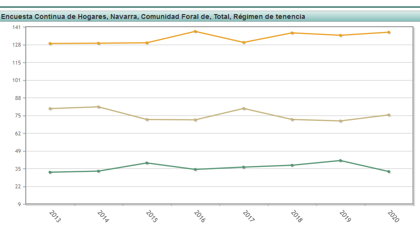 Nafarroako grafikoan ikusten da 2013tik urtez urte izandako bilakaera. Marra laranjak norberaren jabetzako etxebizitza kopuruak adierazten ditu, marra marraioak hipotekadun etxebizitzak eta marra berdeak alokairuko etxebizitzak.