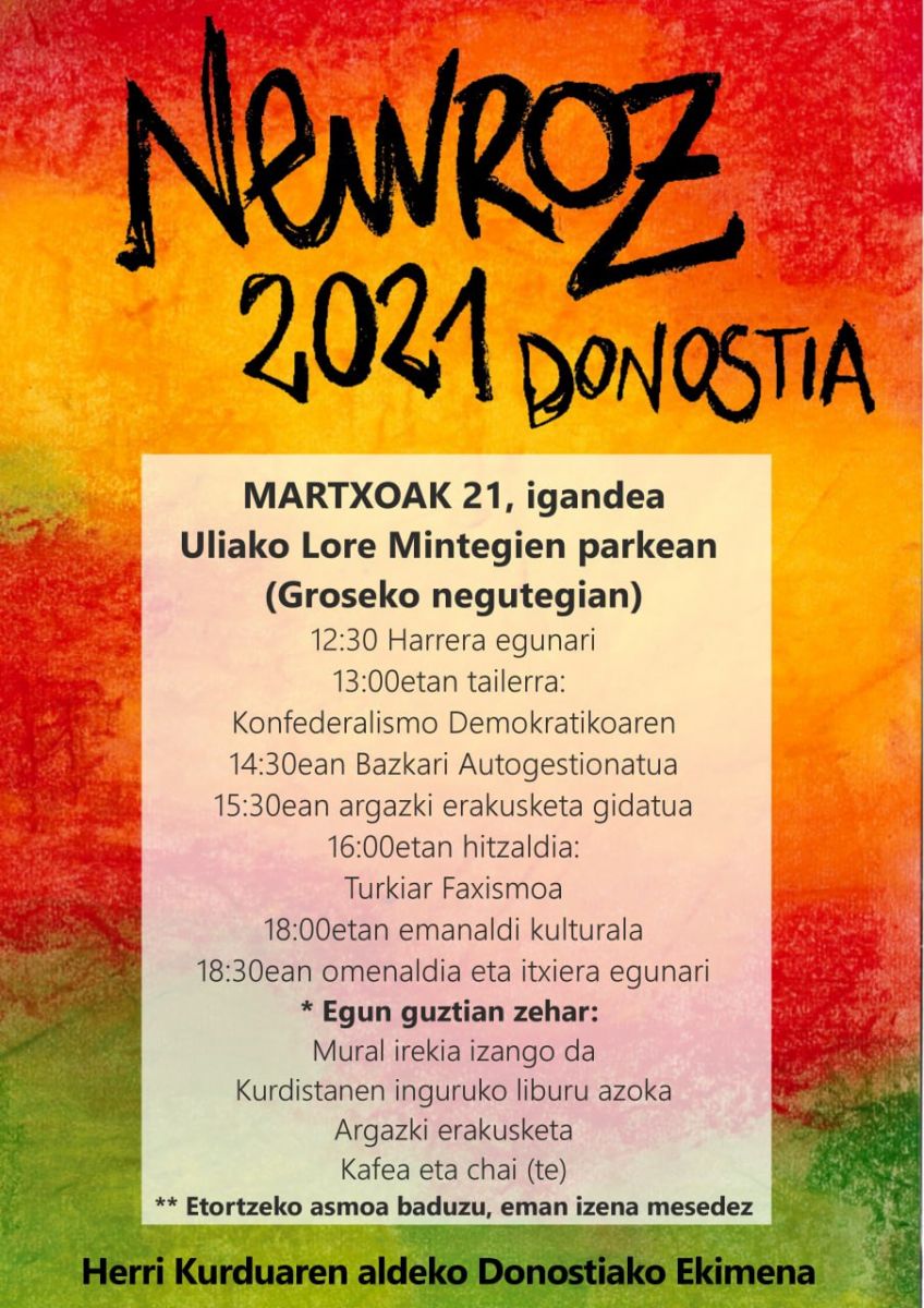 • Uliako Lore Baratzeetan izango da eta egun osoko egitaraua antolatu du Herri Kurduaren Aldeko Donostiako Ekimenak. Martxoaren 21ean, urtero milioika kurduk udaberriaren iritsiera ospatuz, herri gisa badirela nor aldarrikatzen dute. Aste honetan PKKko buru Abdullah Oçalan APO hil ote den zurrumurruak zabaldu dira, eta adibidez, bere ilobak hedabide kurdu bati adierazi dio ezin dutela berarekin harremanetan jarri eta ez dakitela nola dagoen.