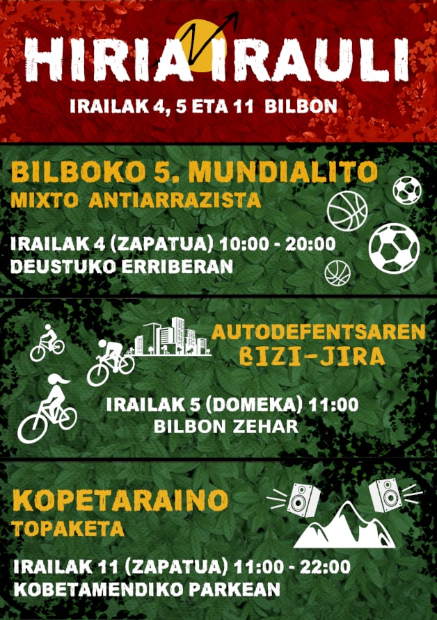 Hiria Irauli irailaren 4an abiatuko da, Deustuko Erriberan gauzatuko den Bilboko V. Mundialito Antiarrazistarekin; 10:00etan hasita, futbol eta 3×3 saskibaloi partidak jokatuko dira. Biharamunean, 10:00etan Autodefentsaren Bizi-Jira abiatuko da hirian zehar, bizikletan paseoa egin bitartean Bilboko gatazka desberdinen oraina eta etorkizuna ezagutzeko tartea hartuz. Egitaraua irailaren 11an Kobetamendiko Parkean egingo den Kopetaraino topaketak itxiko du; kaleko irratsaioak, herri azokak zein emanaldi kulturalek beteko dute eguna.