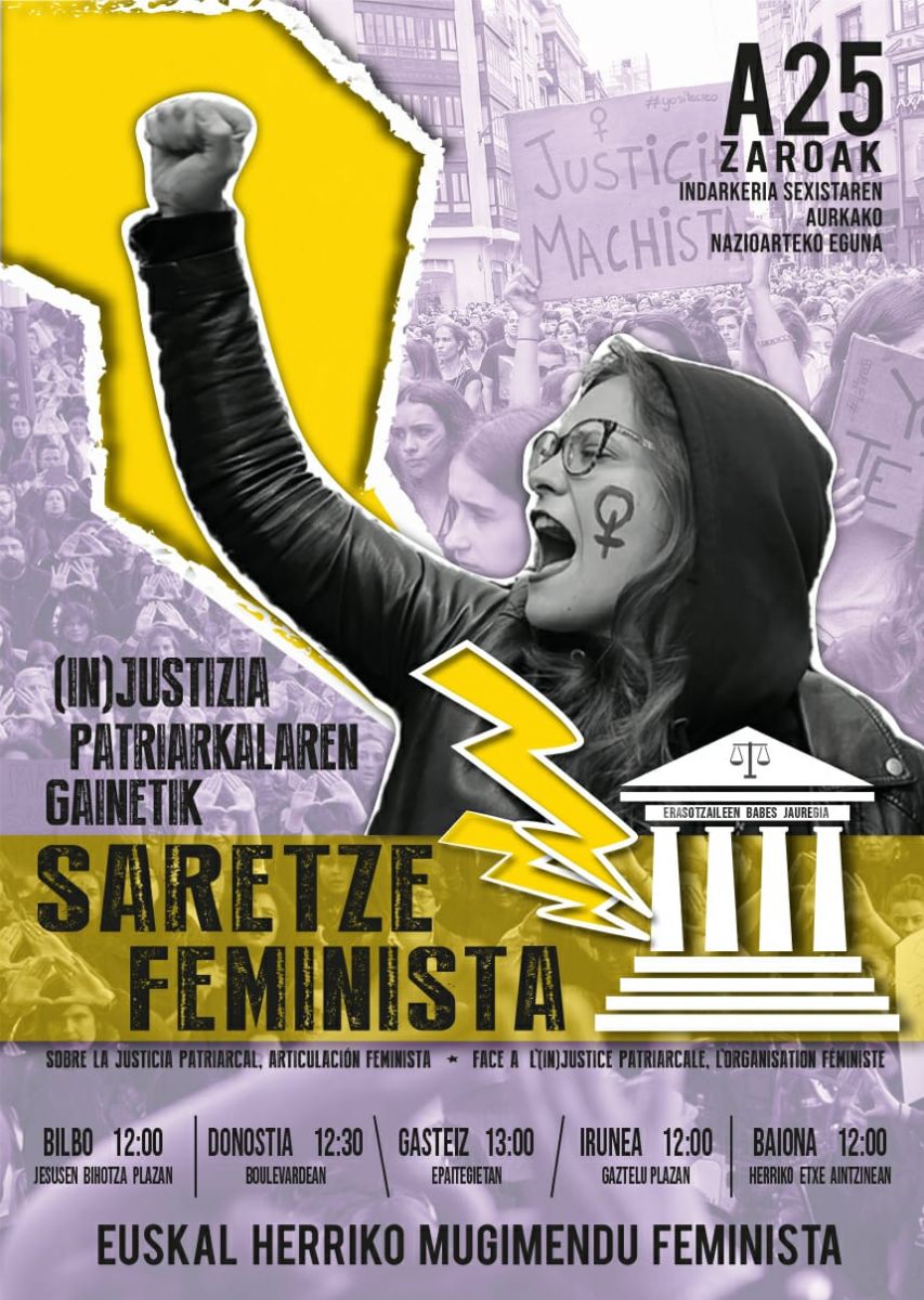 Sistema judizialaren erabakiekin “nazkatuta”, Donostiako epaitegien aurrean egin dute agerraldia Euskal Herriko Mugimendu Feministako ordezkariek. Bertan azaroaren 25erako Euskal Herriko hiriburuetan antolatu diren manifestazioen berri eman dute, eta deialdien lemak adierazten duenez, justiziaren izaera patriarkalaren kontrako aldarria nagusituko da hauetan. “Injustizia patriarkalaren gainetik, saretze feminista!” leloarekin abiatuko dira manifestazioak igandean Bilbo, Donostia, Gasteiz, Iruñea eta Baionatik.