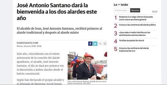 Batzar Nagusietakoa ez da izan Irungo Alardeak azken egunetan eman duen albiste bakarra. Sare sozialetan eta mezularitza-aplikazioetan El Diario Vasco egunkariaren webguneko albiste baten antza daukan pantaila-argazki bat asko zabaltzen ari da: albisteak dio Jose Antonio Santano Irungo alkateak (PSE-EE) lehenbiziko aldiz harrera egingo diola Irungo Alarde parekideari.