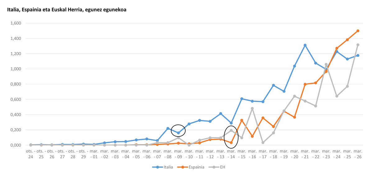 Goazen lehenbiziko grafikoarekin. Italian, Espainiako Estatuan eta Euskal Herrian martxoaren 23a arte hildakoen bilakaera kurbak oso antzekoak baldin baziren, martxoaren 26an hiru herrialdeek joera ezberdinak erakusten dituzte. Italian heriotza kopuruak goraka jarraitzen badu ere, erritmoa estabilizatu egin du eta orain 13,5 heriotza ditu 100.000 biztanleko. Aldiz, Espainiaren kurbak igoera azkartu du azken egunetan eta Italiaren zifretara inguratzen ari da (8,8 heriotza 100.000 biztanleko). Lehen Espainiak bost eguneko atzerapena baldin bazeraman Italiarekiko, hiru egun geroago lau egunera laburtu da atzerapen hori. Euskal Herriari dagokionez, martxoaren 24an eta 25ean igoera mantsotu zen arren, martxoaren 26an Espainiaren antzeko igoera jasan du. Hala ere, martxoaren 26an Euskal Herria Espainiako hilkortasun tasaren azpitik agertzen da orain (7,3 heriotza 100.000 biztanleko) eta Italiarekiko 5 eguneko atzerapenari eusten diola dirudi.