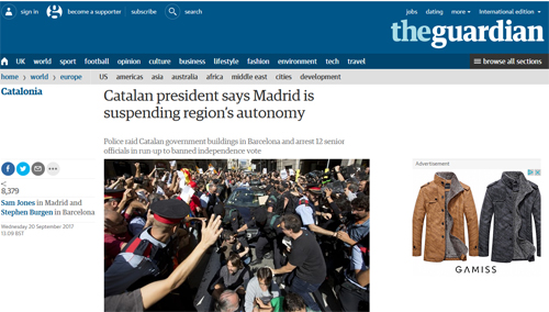 Egunkariek tentsioaren gorakada islatu dute, kalean erreferendumaren aldekoen protestan ikusten diren argazki ikusgarriekin eta toki handia emanez gaiari. Era berean, Puigdemont Kataluniako presidentearen salaketa jaso dute, "herrialdearen autonomia bertan behera" geratu delako, The Guardian-en arabera. The Independent egunkari britainiarrak dio poliziak gobernu eraikinak "asaltatu" dituela eta The Timesek, berriz, erreferenduma "erreprimitu" dutela.