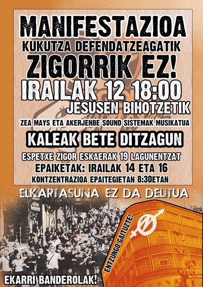 Bilbon “desordena publikoa” eta “erresistentzia” leporatzen diete auziperatutako 19 gazteei, eta 18 hilabetetik lau urte eta erdiko espetxe zigorra eskatzen du fiskaltzak haientzat. Kukutza bizirik. Elkartasuna ez da delitua! lelopean abiatuko da manifestazioa Bilboko Jesusen Bihotzetik 18:00etan. Zea Mays eta Akerjembe Sound Sistemak bertan izanen dira giroa alaitzen.
