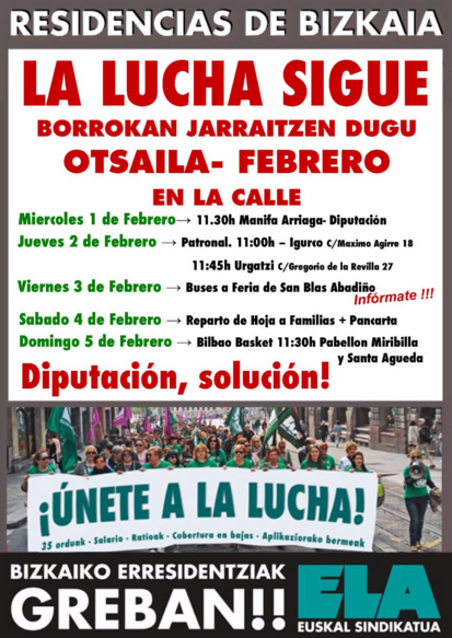Lanuzte berriak hasiko dira bihar Bizkaiko zahar-etxeetan, eta otsailean zehar luzatuko dira. Sektoreko ordezkariek "borrokan jarraitzeko" asmoa adierazi dute, harik eta "azaldutako eskakizunak betetzen diren arte, ratioak hobetzeko behar besteko diru sailak bideratzen diren arte, zentroetako pertsonala handitzen den arte, eta langileei lan-baldintza duinak eskaintzen zaizkien arte".