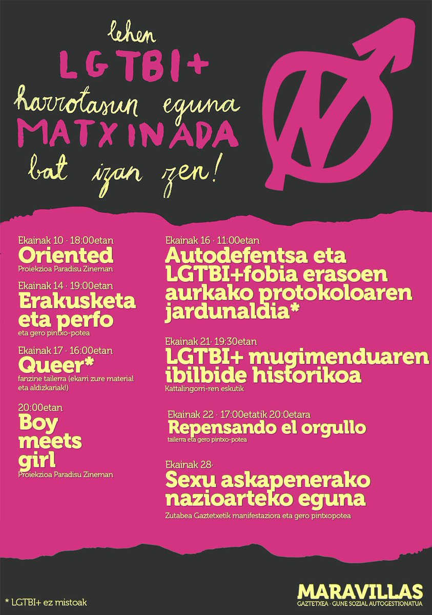 Adibide gisa, aste honetakoa: 14an, erakusketa zabalduko dute, 19:30ean eta, ostean, pintxo potea izanen da; ekainaren 16an, autodefentsa eta LGTBI+fobiaren erasoen aurkako protokoloaren jardunaldia; 17an, fanzine tailerra.