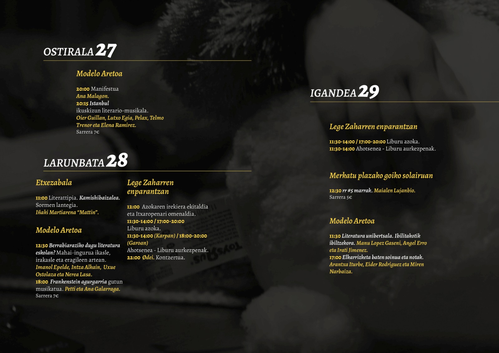 Ana Malagonek irakurriko du asteburuari hasiera emango dion manifestua, maiatzaren 27 iluntzean. Aurten, “Piztia” hautatu dute ekimenaren gai gisa, eta hortik tiraka idatzitako testua irakurriko du Malagonek. Aurtengo egitaraua aurkezteko egindako bideoan ageri denez, hura aurkitu, baretu eta pizteko balio baitu literaturak. Manifestuaren ostean Oier Guillan, Lutxo Egia, Pelax, Telmo Trenor eta Elena Ramirezek Istanbul ikuskizuna emango dute Modelo aretoan.