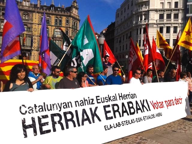 ELAS, LAB, ESK, Steilas eta Hiru sindikatuek deituta ehunka lagun bildu dira Hego euskal Herriko lau hiriburuetan Kataluniako autodeterminazio erreferendumari babesa eman eta herrialde hartan herritarrak jasaten ari diren errepresioa salatzeko.