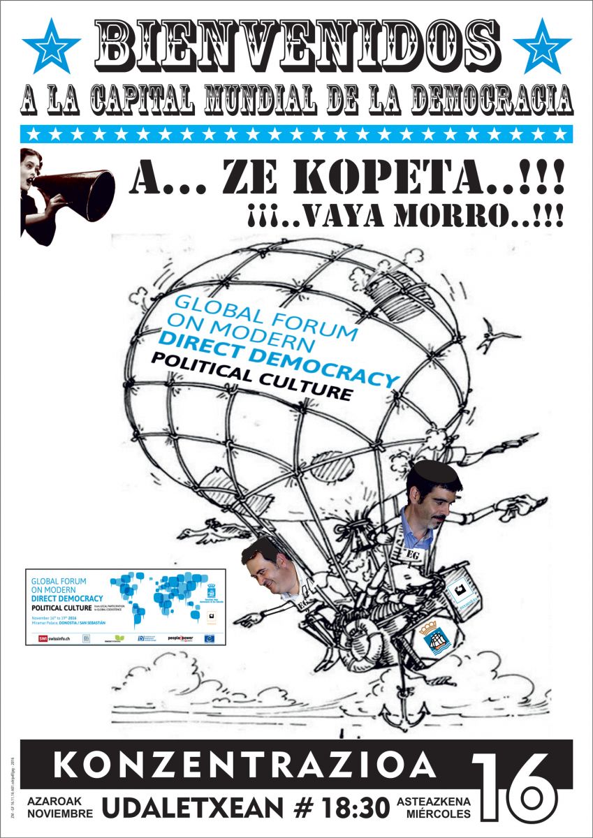 Donostiako Udalak “Demokrazia Zuzen Modernoari buruzko Foro Globala” antolatu zuen 2016ko azaroaren 16tik 19ra, hiria “Demokrazioaren Munduko Hiriburu” gisa aurkeztuz nazioarteko gonbidatu eta partehartzaileen aurrean. "Ekitaldi hura hipokrita eta zinikoa zelakoan, herri-mugimendu guztiei deialdia egin genien Satorralaia bizilagunen mugimenduak errealitatean bizi ditugun partehartze-falta eta inposaketa egoerak ikustarazteko, bai Metroaren pasantearen aferan eta errauskailuaren auzian, etxe kanporakaten auzian, eta abar", diote deitzaileek.