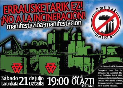 • Uztailaren 21ean manifestazioa egingo dute Olaztin (Nafarroa), FCC enpresaren porlan fabrikan hondakinak erraustearen kontra protesta egiteko. Manifestazioa deitu dutenek diotenez, lantegi horrek baimenak lortu nahi ditu 20.000 tona zabor eta 16.500 tona plastiko, lokatz, pneumatiko eta abar erraustu ahal izateko.