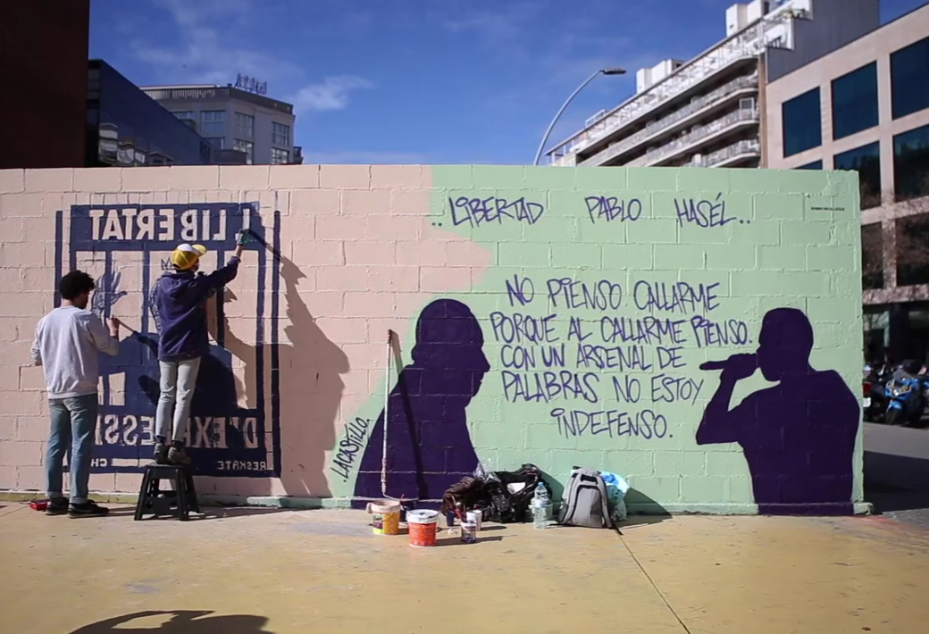 Hirietako muralgileak otsailaren 7an Bartzelonako Tres Xemeneies parkean elkartu ziren Pablo Hasélekiko elkartasunez hainbat horma betetzeko. Raperoak berehala kartzelaratzeko agindua jaso du, bi urte eta bederatzi hilabeteko kondena betetzeko terrorismoa goresteagatik, eta segurtasun indar zein koroarekiko laidoengatik. Egindako artelan deigarrienetako bat izan da Roc Black Block-ek egin duen Juan Carlos erregearen irudia eta handik ordu batzuetara hiriko garbiketa zerbitzuek ezabatu egin dute.