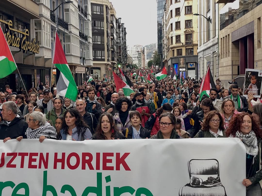 Gure Haurrak Badira plataformak deituta larunbatean manifestazioa egin dute Bizkaiko hiruburuan. Israelek Palestinan eginiko genozidioan milaka adin txikiko oroitu dituzte eta palestinar herriaren existitzeko eskubidea aldarrikatu dute.