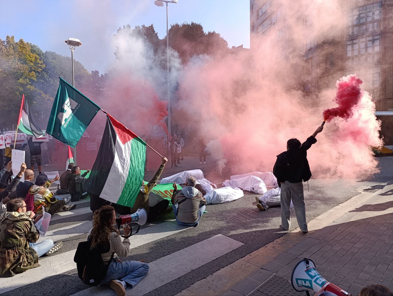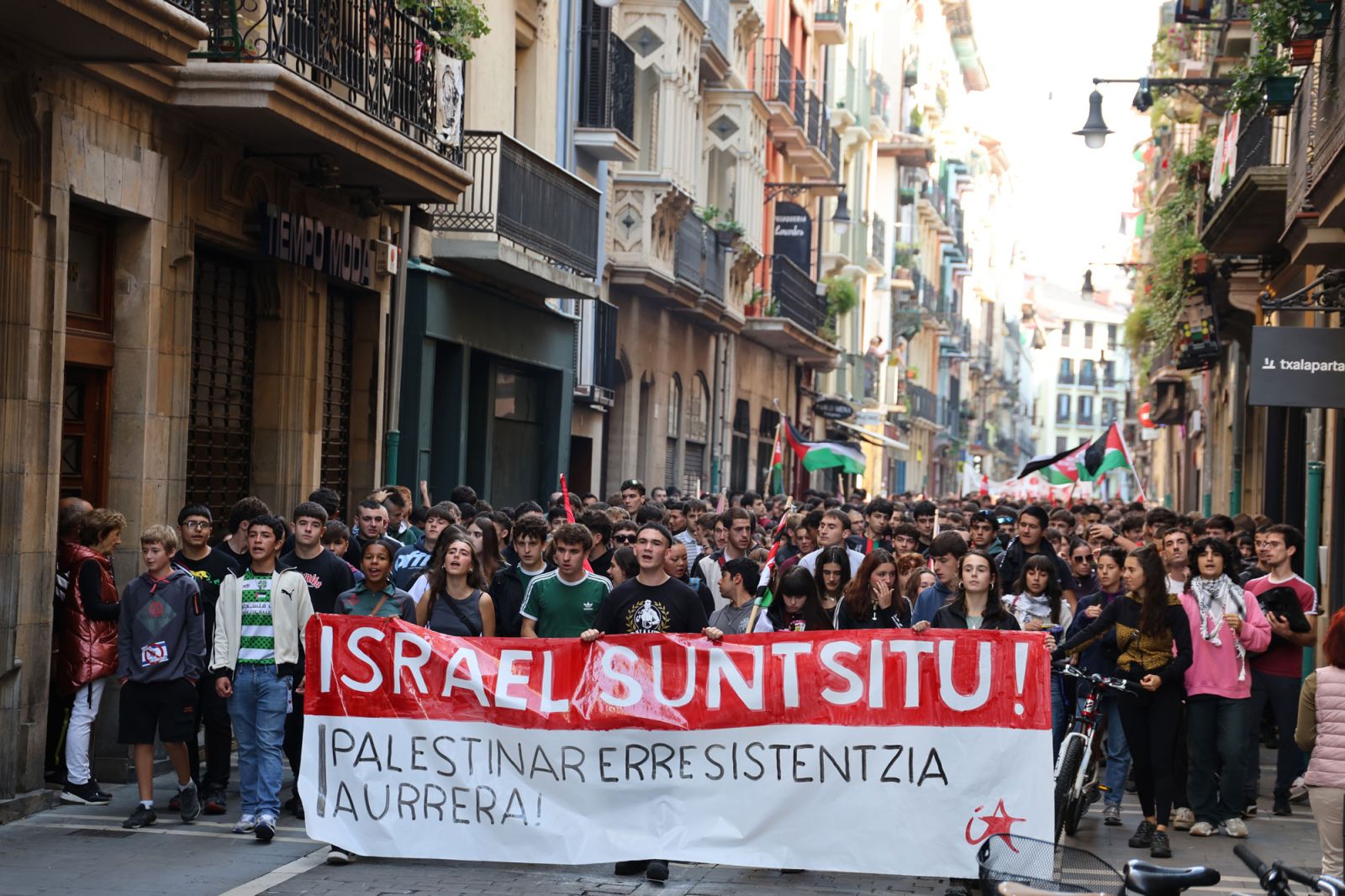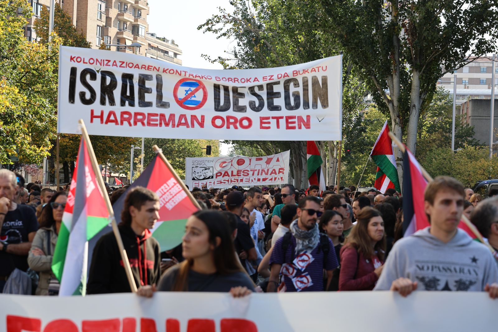 Abiatu da manifestazioa Baiona etorbidean barrena, baina Europako plazan istiluak egon dira Poliziaren eta gazte taldeen artean. ARGIAk bertan ziren lekukoen aldetik jaso duen testigantzaren arabera, gazteak Israelen aurkako eranskinak jarri dituzte Burger King batean eta terraza bateko aulkiak jaurti dituzte haren aurka. Ondoren Espainiako Poliziak gazteen aurka oldartu da, eta gazteek hondakin-ontziak atera dituzte errepidera. Istiluak ez dira orokortu eta manifestazioak bere bidea egin du, gisa honetako mobilizazioetan diren ohiko oihuekin, nabarmenenak genozidioaren aurkakoak eta Israeli boikota egitearen aldekoak, “Boikot Israel, Palestina askatu” edo “Netanyahu hiltzaile”, esate baterako.