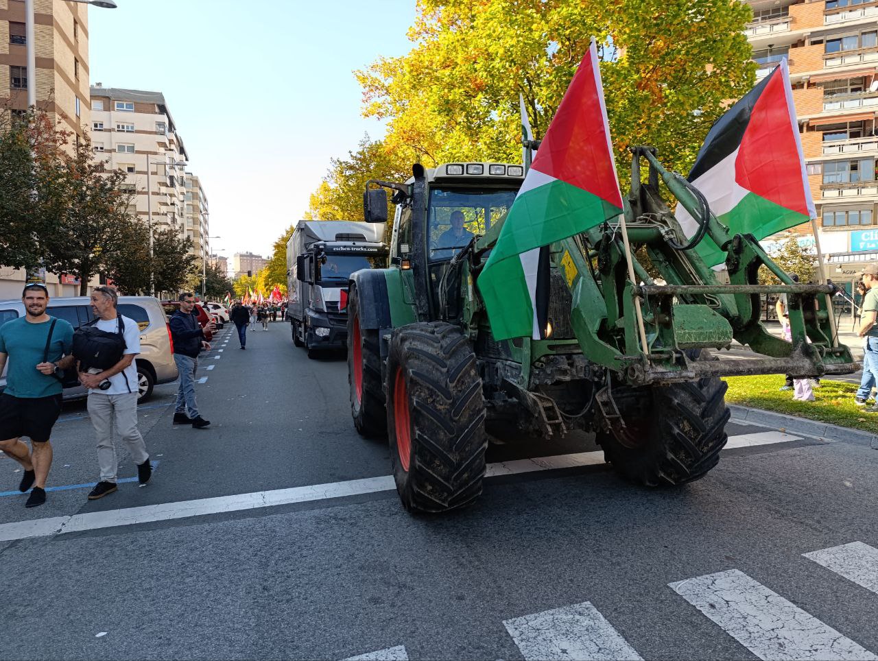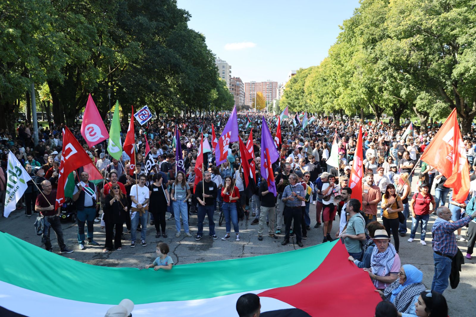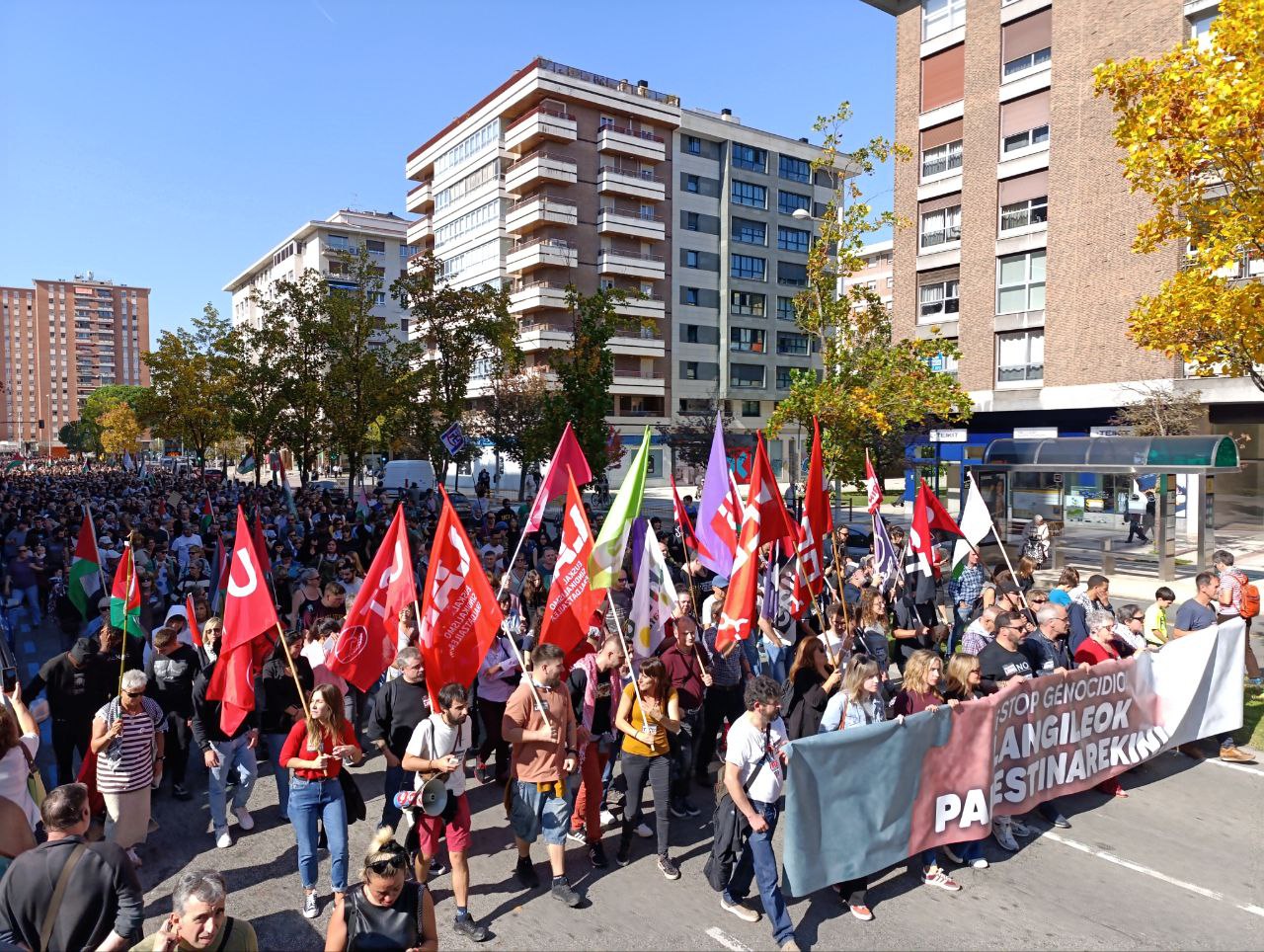 Palestinarekiko elkartasun giroak gora egin du goizetik eguerdira, eta azkenean eztanda egin du Iruñeko Golem Zinemetatik abiatu den manifestazioa jendetsuan: antolatzaileen arabera, 15.000 pertsona bildu dira bertan. Hiru orduko lanuztera deitu duten UGT, CCOO, LAB, Steilas, CGT, Solidari, ESK eta Hiru sindikatuek egin dute deialdia, eta Palestinarekin Elkartasuna plataformak ere sostengua eman dio manifestazioari. Antoniutti parkean amaitu da manifestazioa.