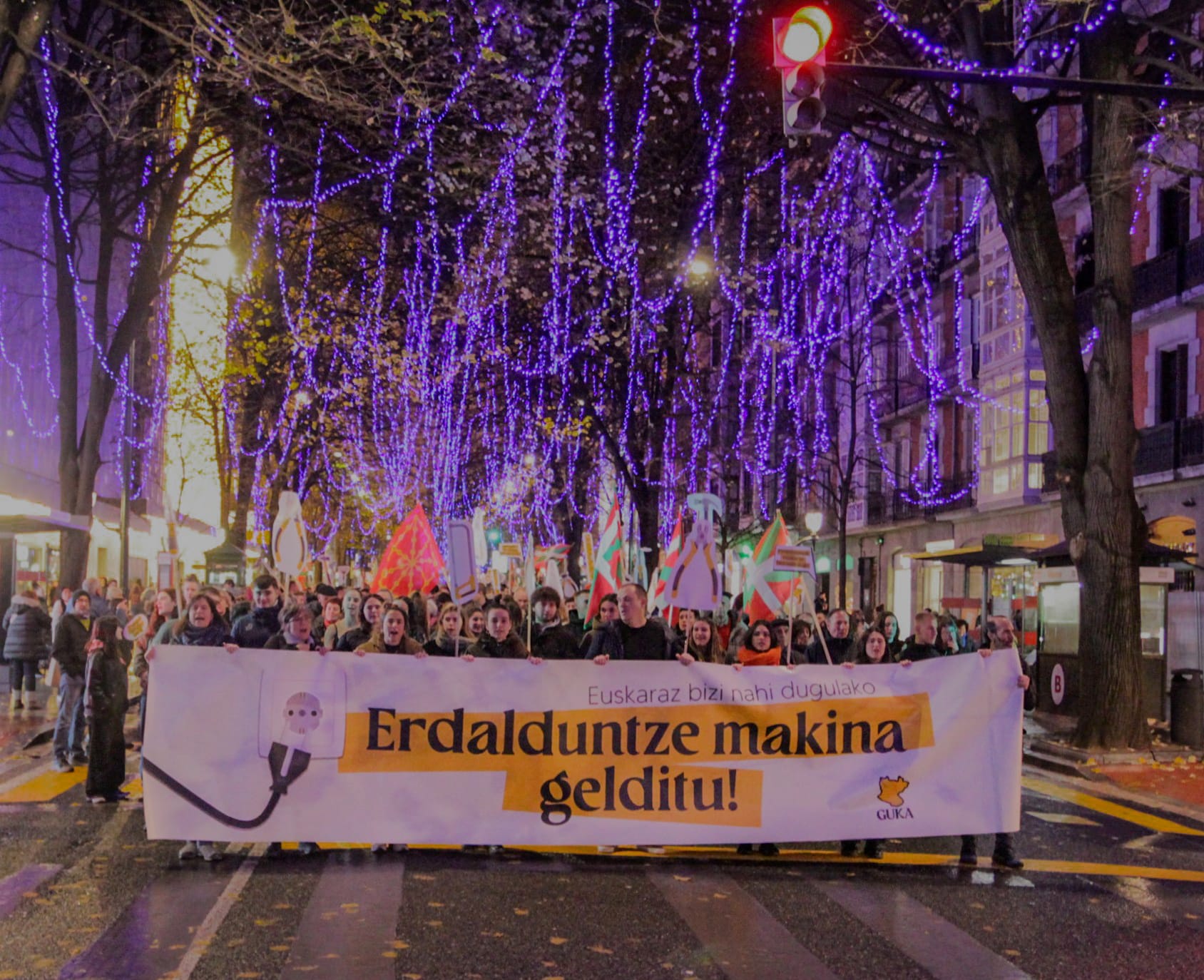 Euskararen egunak ohiko ospakizun eta folkore kutsuez gain, borroka eta aldarrikapen usaina ere izan du aurten Bilbon, euskaldun gehien dituen eremu geografikoan, hain zuzen. Euskalduntze makina gelditu! lelopean, ehunka euskaltzale batu ditu Guka plataformak antolatutako manifestazioak. Eliptika plazan hasi eta Arriaga antzoki parera arte, aldarri ugari entzun dira Bilboko Kale Nagusian, eta amaiera ekitaldian mezu argia luzatu dute: gainontzeko borrokekin transbertsala den euskaltzale borroka aldarrikatu dute, “Euskal Herrian pertsona guztien alde egingo den borroka euskaraz soilik” izan daitekeela sinetsita; eta erakundeei "borondate politikoa" eskatu diote, euskarari balioa emateko duten betebeharra bete dezaten.
