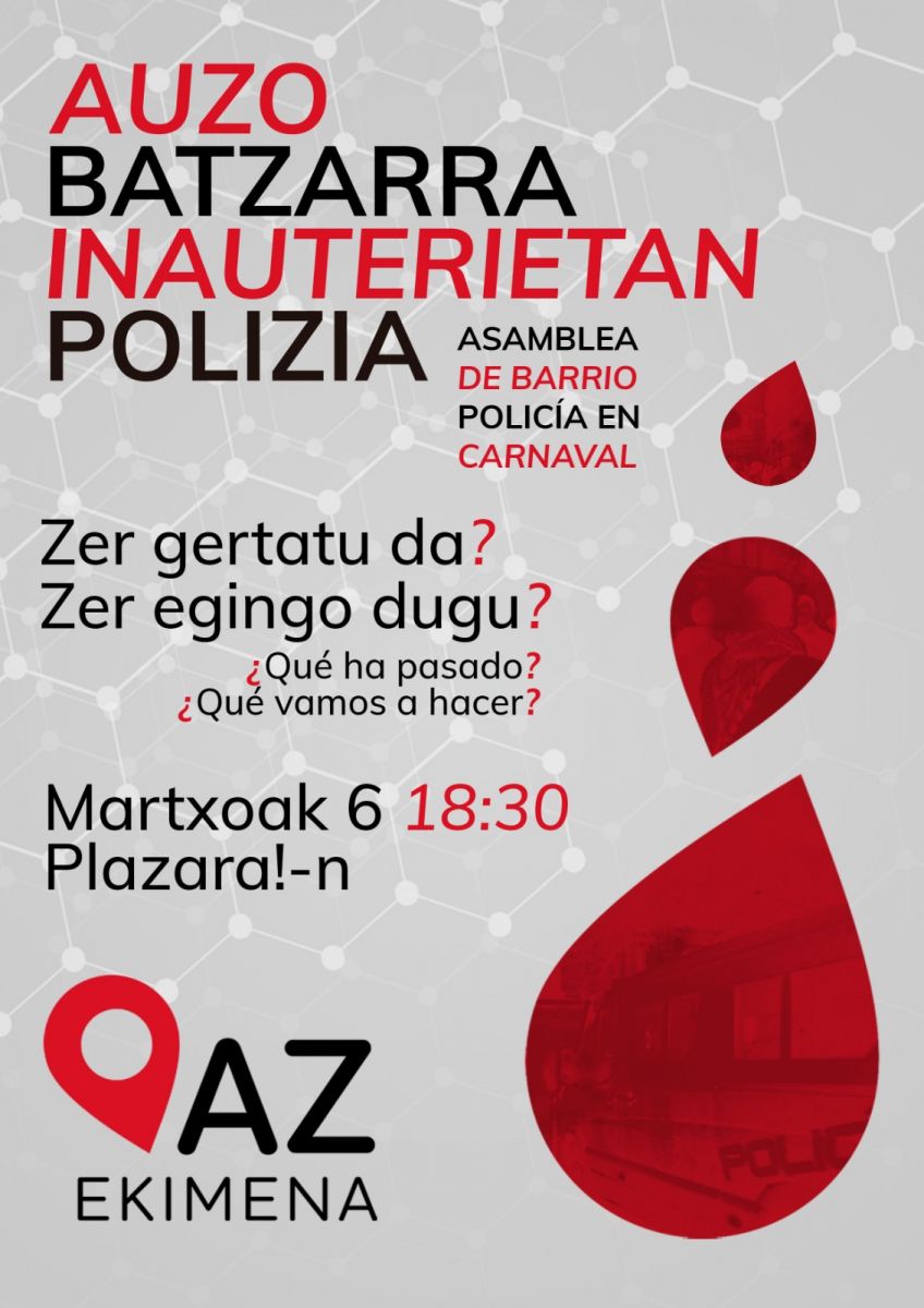 Bestalde, Alde Zahar Ekimenak auzo batzarra antolatu du, inauterietan Espainiako Poliziak egindakoa aztertzeko. Martxoaren 6an izanen da, 19:30ean, Plazara! aretoan. Batzarrera deitzeko deia zitazioon berri izan aurretik zabaldu zuten, "Polizia inauterietan: zer gertatu da? Zer eginen dugu?" leloarekin.