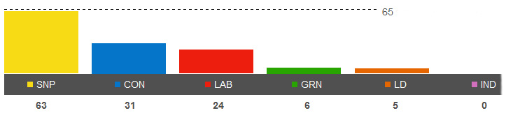 Eskoziako Alderdi Nazionalak alde nabarmena lortu du gainerako alderdiekiko. Kontserbadoreek 31 eserleku eskuratu dituzte, eta laboristek 24. Berdeak izan dira laugarren indar bozkatuena, 6 eserleku lortuta. Alderdi Liberal Demokratak, beraz, babesa galdu du, eta laugarren postutik bosgarrenera jaitsi da, 5 eserlekurekin. Bestetik, RISE ezkerreko koalizio independentista berriak ez du parlamentuan sartzerik lortu.