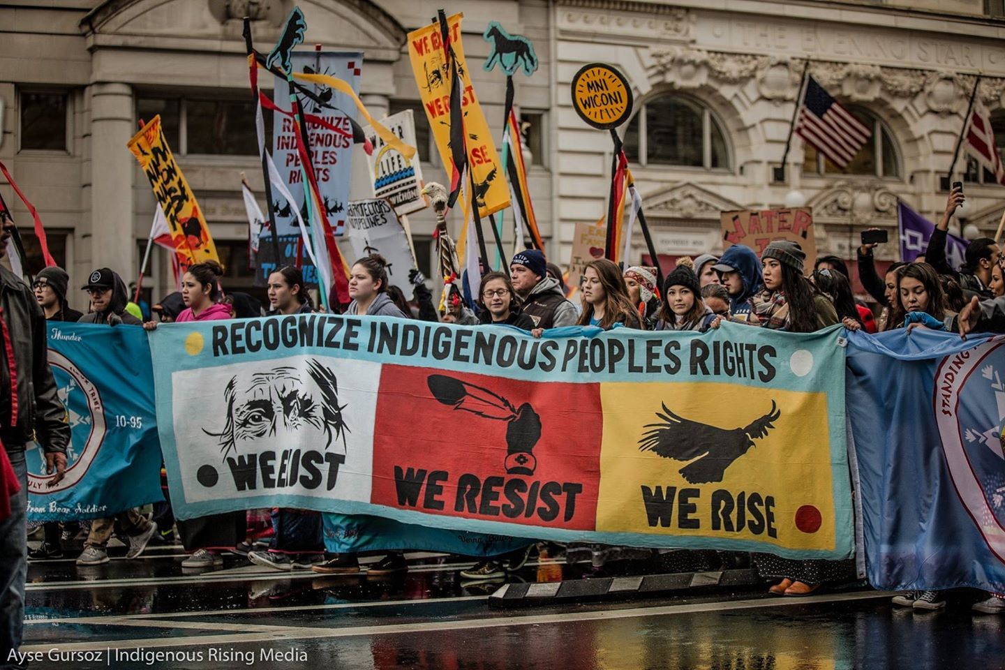 Milaka natibok eta ingurumenaren aldeko ekintzailek manifestazioa egin dute Washingtoneko erdigunean Dakota Acces Pipeline oliobidearen eraikuntzaren kontra protestatzeko.