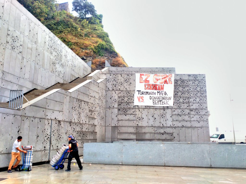 "Turismoaren mafia" eta donostiarren bizitzak kontrajarri dituzte pankartan. (L. A.)