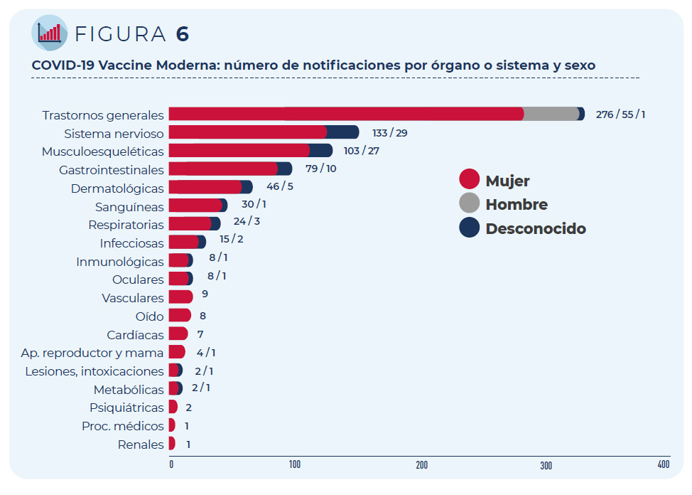 Txertoaren arabera sintomen kopurua aldatzen bada ere, handienetik txikienerako ordena ez da aldatzen, hau da, gehienak "nahasmendu orokorrak" dira, ondoren nerbio sistemari dagokzionak, gero gihar-hezurdurenak, tripakoak, azalekoak... Irudian, Moderna txertoaren ondoren nabaritutako ondoezak, eta sexuaren araberako aldea oso nabarmena.