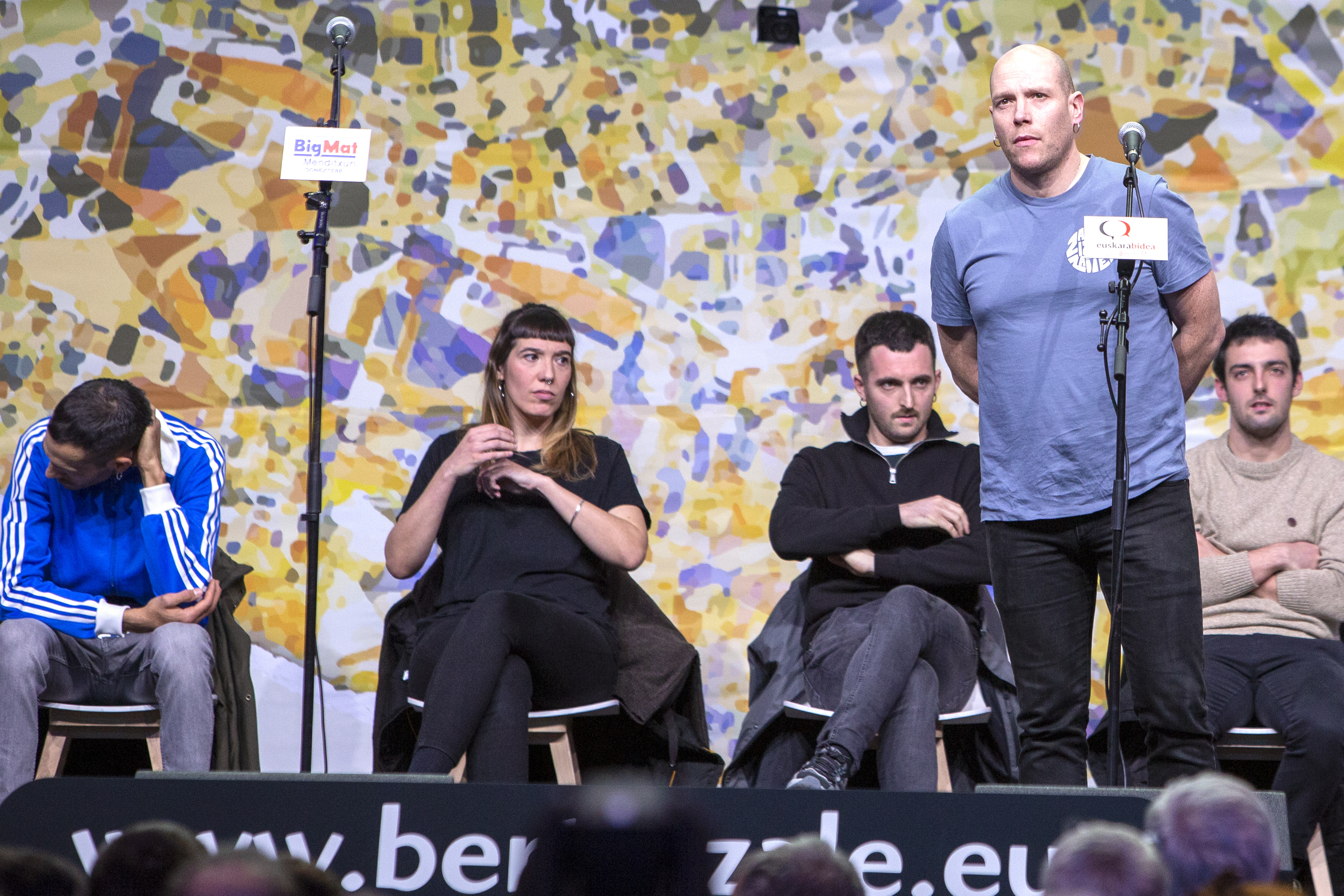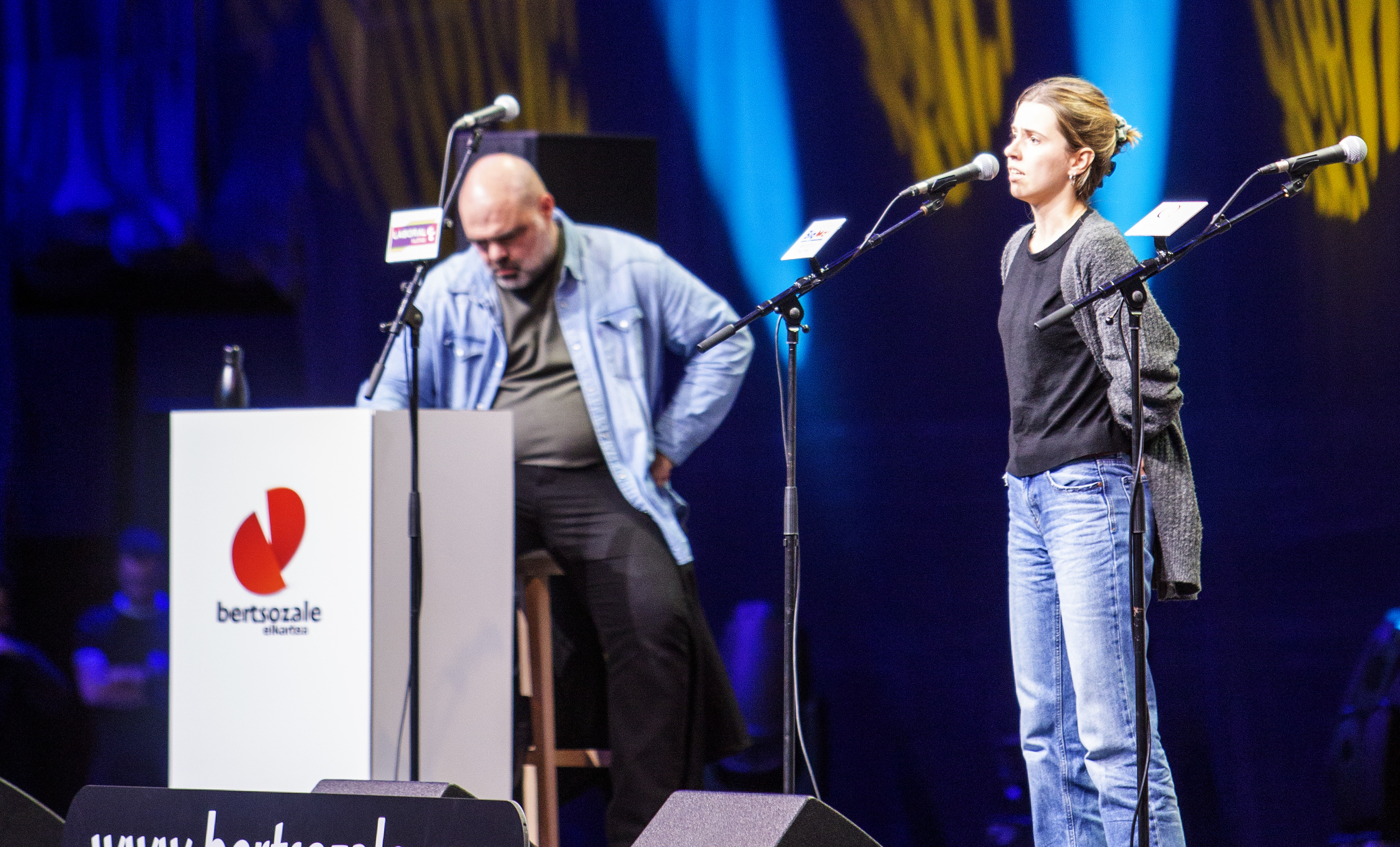 Zortziko handi horretan, lehenak kantatzen lehen finala zuten Ekhiñe Zapiain eta Eki Mateorena izan dira. Oro har saio osoan bezala, Palestinaren genozidioak presentzia hartu du, eta gaia hortik zihoan: kotxea partekatzen dute lanera joateko, eta irratia piztuta daukatela, entzun dute su-etena apurtzen ari dela Israel, palestinar zibilak akabatzen. Hala bota du Zapiainek, ausart eta gordin, ofiziokide dituen kazetariei keinua eginda: “Heriotz aunitz gertatu dira / kazetarien ideian / nahiz eta bihotz ipintzen dugun / han hilko duten kidean / biok lanera kotxean goaz / akaso adibidean / mundu honetan denok baikoaz / bakoitza bere bidean”.