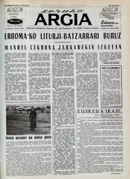–"Gain?gaiñeko" euskal_ idazlea, diozu. Ori uste det txapel aundiegia dala neretzat. 17_ 18 urtekin asi nintzan euskal_ lanetan. Lenbizi itzulpenak egiten Gero, "JAKIN"; "ZERUKO ARGIA" ta "LOINAZ" aldizkarietan zerbait idazten. Orain. Lazkao'n liturpi_gaietaz ateratzen duten "JAUNAREN DEIA"ra bialtzen det, tarteka, lantxo. ren det, tarteka, lantxoren bat.. Ba'ditut eskuartean beste eus. kal_lan batzuk, baiñan nai. aña astirik ez...