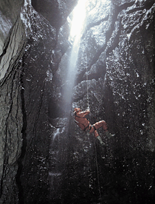 »... entzuten da. Gure txanda da. Hesia gainditu sokari lotu eta hor abiatzen gara. Guztia ondo doa, baina berehala datoz arazoak. Frakzionamendu edo zatikapenera heldu gara. Bertan sokak bere bidea zuzen eta inongo marruskadurarik gabe jarrai dezan, soka paretari atxikia dago. Patxadaz, emandako argibide guztiei kasu eginez, hau ere gainditu, eta behera. Argitasunetik iluntasunera igarotzen ari gara apurka. Hamabost, hogei, hogeita bost, iritsi gara. Oinak lurrean ditugu jada.