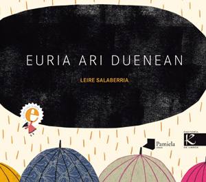 “Euria ari duenean”. Hitz horiekin, edo ideia horretatik, abiatzen da kontakizun labur hau. Leire Salaberriak euria ari duenean egiten dituen ekintzak adierazten dizkigu, zer gustatzen zaion, zer egiten duen, nola jokatzen duen… zergatik duen gogoko euria, alegia. Eta ideia hori oso modu sinplean adierazten zaigu, testu aldetik ideia argiak eta tinkoak esanez: “Gelako lagunekin batera, putzuetan egiten dut arrantzan eskolatik irtetean. Koloretako arrainak harrapatzen ditugu, guk bakarrik ikusten ditugun horietakoak, magikoak”; baina sinpletasun hori testuaz gain irudietan ere ageri zaigu. Collage modukoak, perspektiba faltsuak, sinbolismo handiz… irudiek haurren mundura, haurren ikuspegietara hurbiltzen gaituzte, Salaberriak idazkera ez ezik ilustrazioa ere haurren tonuarekin bat eginez sortu baitu. Hots, istorioa kontatzen digun bezala neskatxa horrek berak irudikatzen dituela narrazioarekin datozen irudiak.