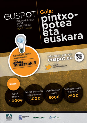 “Pintxo-potea eta euskara”. Euskal Herriko edozein herritarrek, eta irizpide batzuk betez gero atzerriko batzuek ere, parte hartu dezakete Euspoten. Maiatzaren 9ra arte dago lanak bidaltzeko aukera. Lehiaketak 2.250 euro banatuko ditu irabazleen artean. Lau sari izango dira. Spot onenak 1.000 euro jasoko ditu, Mondragon Unibertsitateko ikasleen spot onenak 500 euro, Publikoaren sariak beste 500 euro eta Gazteen sariak (18 urtetik beherakoak) 250 euro. Antolatzaileak Aretxabaletako Udala, Mondragon Unibertsitatea eta Arteman Komunikazioa dira. Aurreko bi ekitaldietan arrakasta izan zuen Spotek. Iaz adibidez 22 lan jaso zituzten.