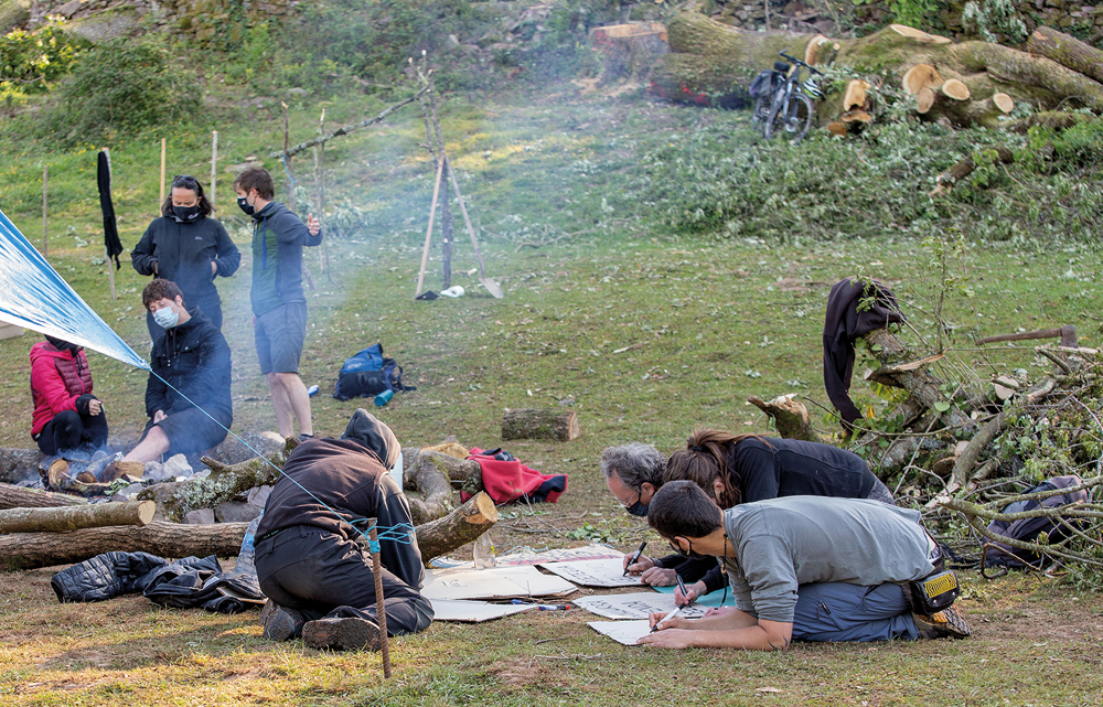 Golf zelaia eraikitzeko lursailean boleibol zelai inprobisatua egin dute akanpadako kideek eta jolasean ari dira batzuk. Beste batzuk txalaparta jotzen, elkarrizketan, musean edo kartelak egiten. Tentsio uneak izan dira, baina espazioaz eta jendeaz gozatzeko tarte lasaiagoak ere badira. Hori bai, motozerra soinua entzunez gero, denak segituan alerta. “Lasai, ondoko baserrikoak dira-eta…”, esan du norbaitek, eta barreak etorri dira segidan.