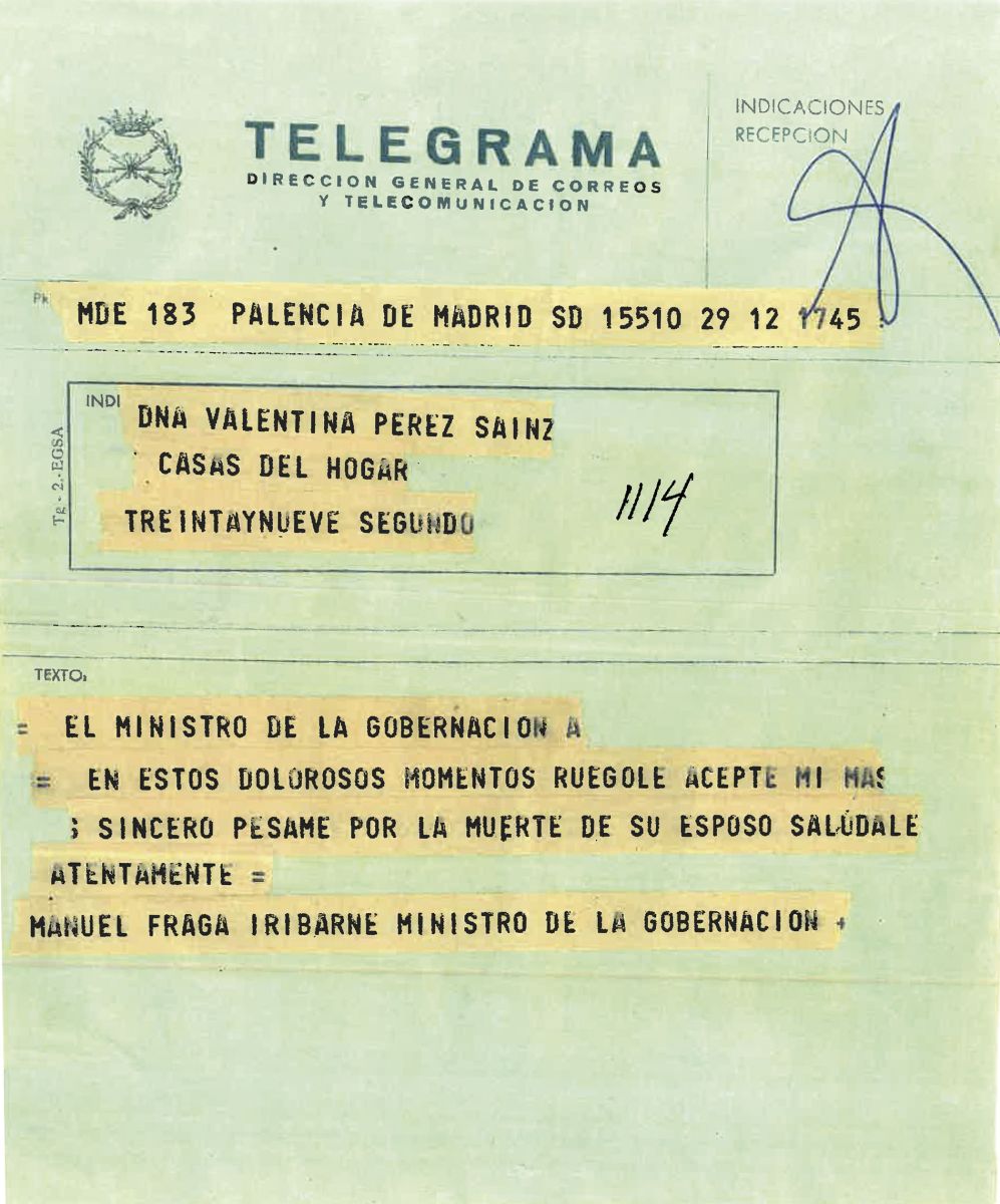 1976an Zarauzko hartan hildako Felipe Suarez Delgadoren alarguna da Valentina Pérez Saiz. Palentziako (Espainia) jaioterrian da senarra hil ziotenetik. 50 urte atzera egin eta hasi zaigu: “Gure aita telegrafoetako langilea zen, eta Zestoan jardun zuen lanean, bainuetxeko bulegoan. Zestoan zegoela, Koiote tabernan bizi izan zen, apopilo, eta, geroko batean, nire senarrak –telegrafoetako langilea hura ere–, destinotzat Zestoa hartzeko aukeran izan zuenean, gure aitak haraxe joateko esan zigun, herria polita zela; jendea, adeitsua; gustura egon zela bera han. Haren hitzei jarraikiz joan ginen geu ere Zestoara –senarra eta biok eta bi haurrak–, telegrafo-etxean destinoa hartuta”. Valentina Pérezen inguruan denak ziren telegrafoetakoak: “Gure aita, nire ahizpa, neba, ni neu geroago, eta, denak har, nire senarra, Felipe Suarez Delgado, Zestoako Posta eta Telegrafo bulegoko buru garai hartan”, hau da, 1975eko azarotik 1976ko apirilera arte, Guardia Zibilak Zarautzen tiroz hil zuen arte.