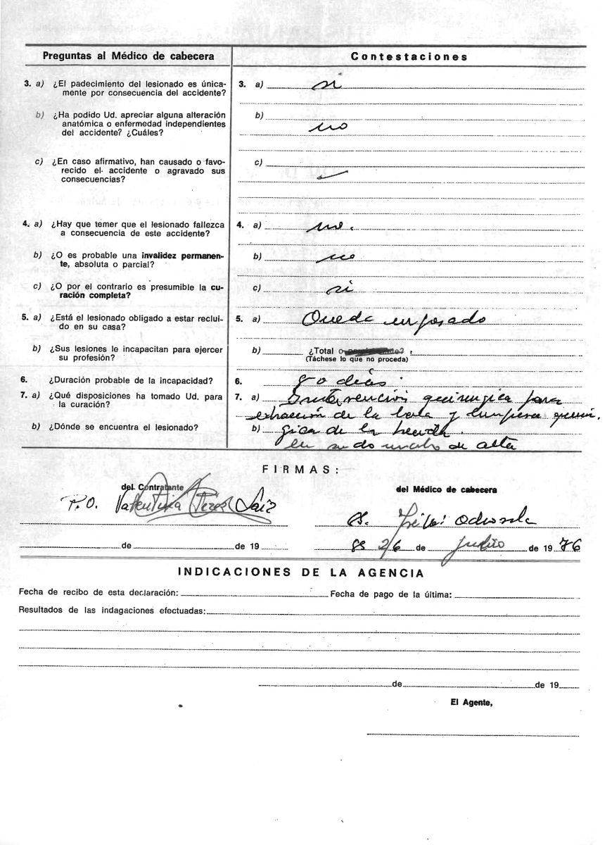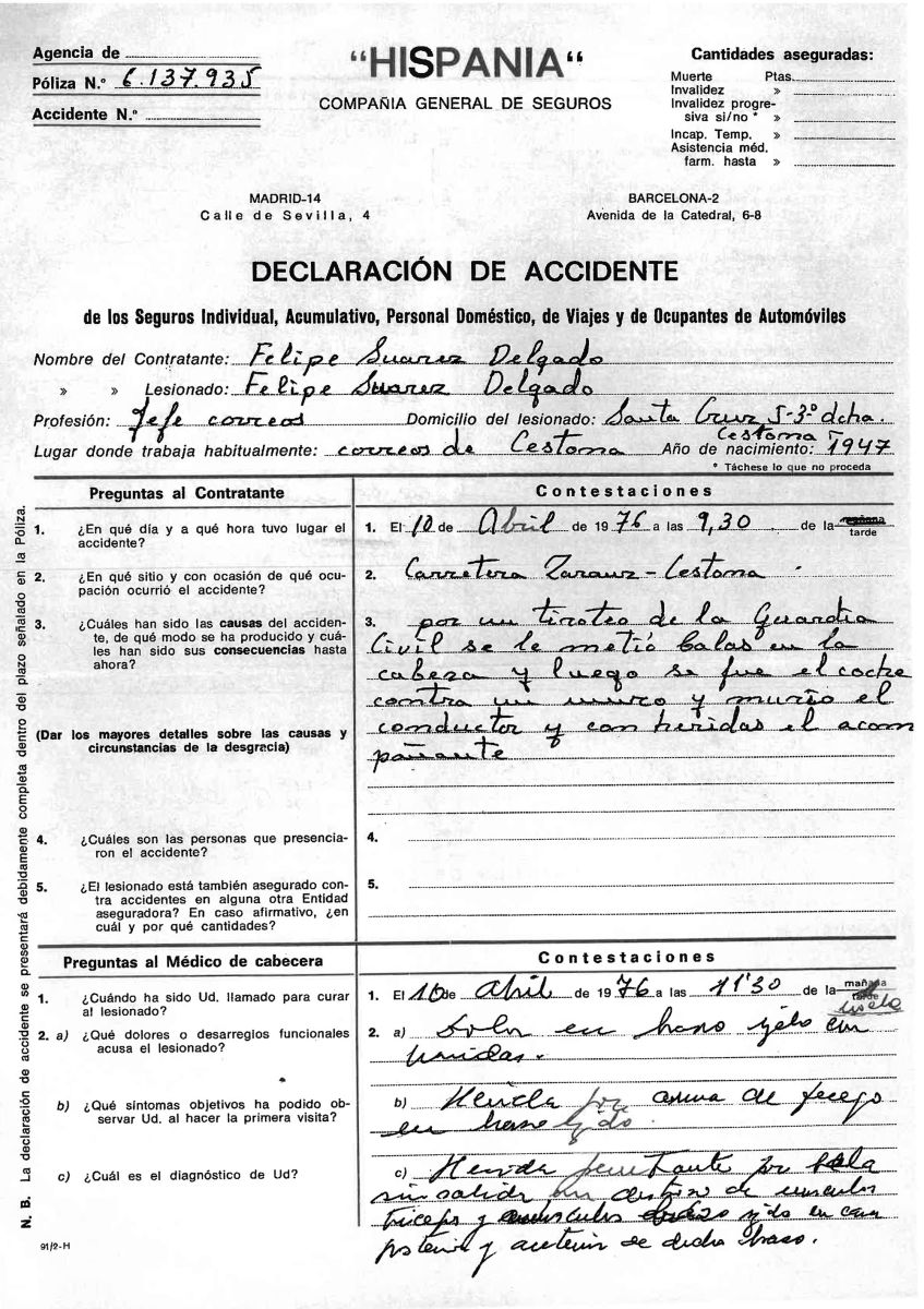 Erran delako jakinarazpena 1976ko apirilaren 10eko “istripuaz” ari da. Felipe Suarez Delgado ageri da aseguruaren kontratatzailea eta, halaber, bera da galderei erantzuten diena. Baina hori guztiz gauza ezinezkoa zen, bala baitzeukan buru barruan, metrailak garuna leherturik, eta, finean, Suarez Delgadok ez baitzuen inoiz konortea berreskuratu!